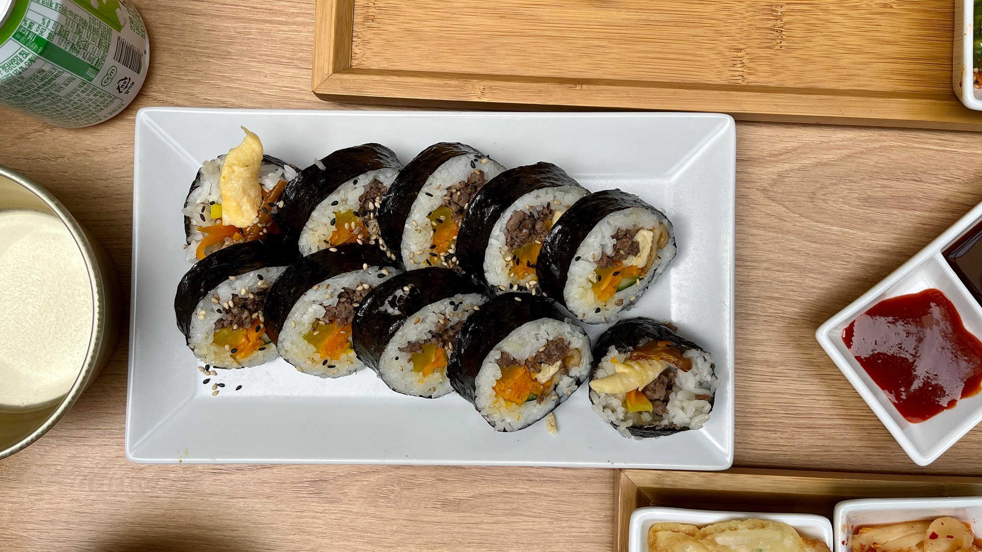Ryžová rolka Kimpap, môže byť s mäsom aj bez.