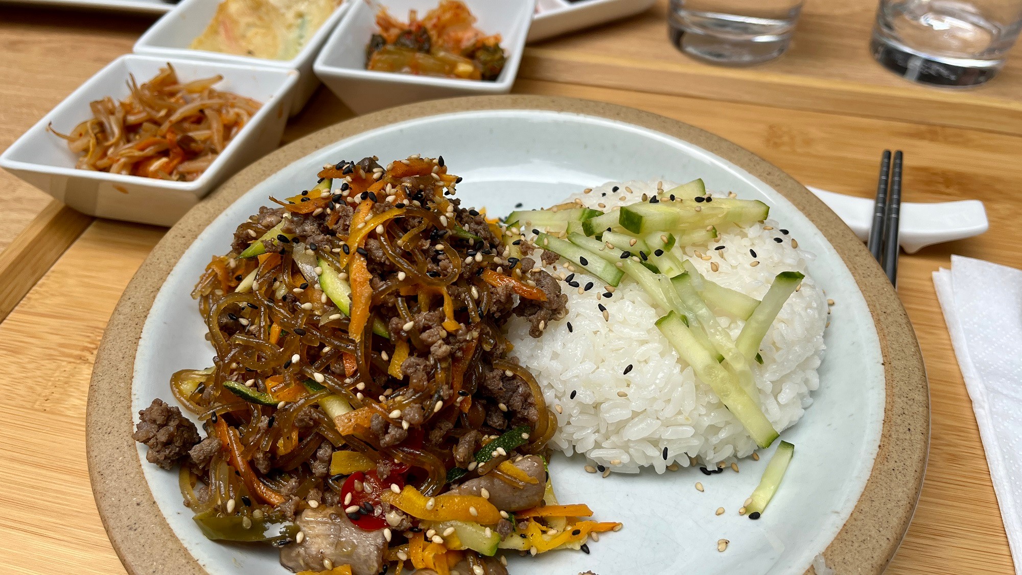 Odporúčame aj Hovädzie Bulgogi (12,90 €), ktoré pripravujú s kórejskou verziou BBQ marinády. Je to mierne pikantné jedlo, chuťovo vyvážené, naozaj potešilo. Tenké plátky mäska boli akurát vo veľkosti na sústo do úst, k nim sme mali opäť kopček ryže. Príjemné chute jedla sme kombinovali s troma „banchan“ prílohami, z jednej misky sme si naberali marinované klíčky, z druhej kocky marinovanej reďkovky a z tretej kimči z fermentovanej pekinskej kapusty. Aj toto bola výborná a ľahká špecialita, ktorá síce celkom rýchlo zasýti, ale trávenie nezaťaží.