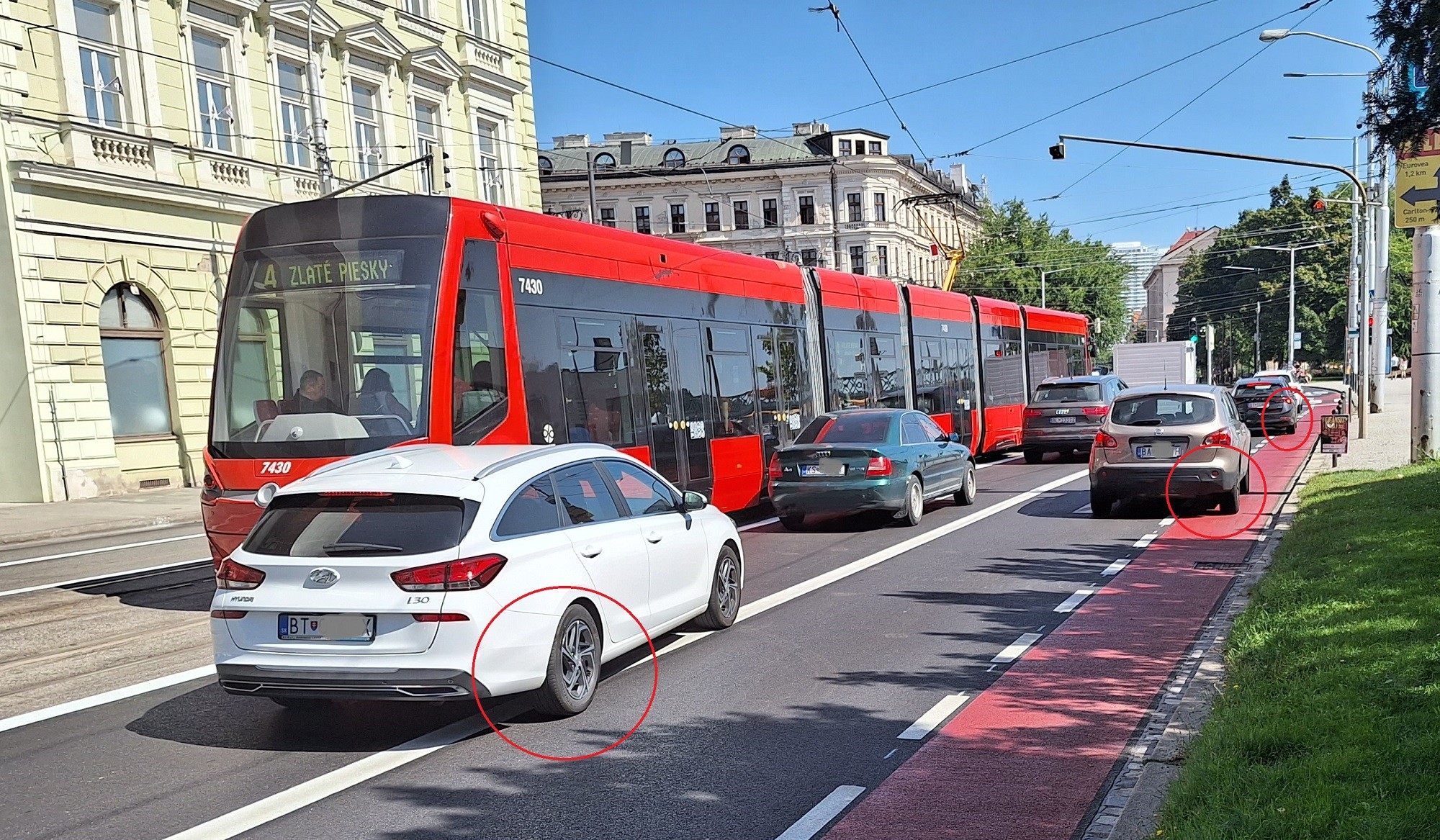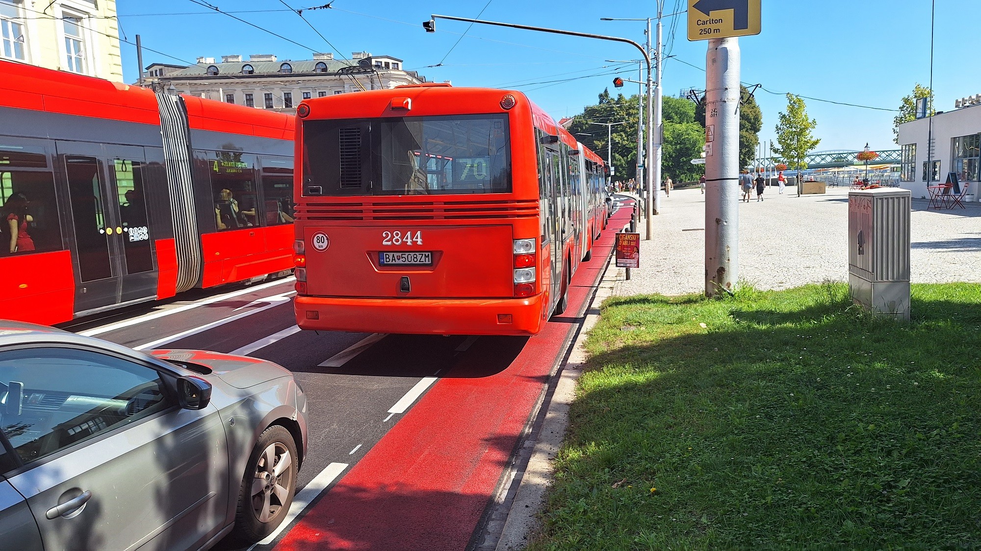 Pokiaľ ide o autobusy, podstatný je teda pred Námestím Ľudovíta Štúra pravý pruh a jeho šírka. A ako sme už písali, sem sa autobusy vojdú len tak-tak a často trčia buď do cyklopruhu (ako vidno na jednej z fotografií vyššie v článku) alebo do ľavého pruhu. Ak sa autobusár maximálne snaží, do pruhu sa mu veľmi natesno podarí dostať, ale či je to takto v poriadku a bezpečné, posúďte sami z fotografie nižšie. Podľa prerušovanej čiary však, ako nás upozornil čitateľ, na tomto krátkom úseku pred križovatkou ide o ochranný pruh pre cyklistov a nie segregovanú cyklotrasu. Do ochranného pruhu za istých okolností širšie vozidlá vstúpiť môžu. Potvrdil nám to i Dan Kollár: "Ochranné pruhy sa vyznačujú tenkou prerušovanou čiarou, samostatný cyklopruh hrubou plnou čiarou (resp. je prerušená len v mieste vjazdov, odbočenia)."
