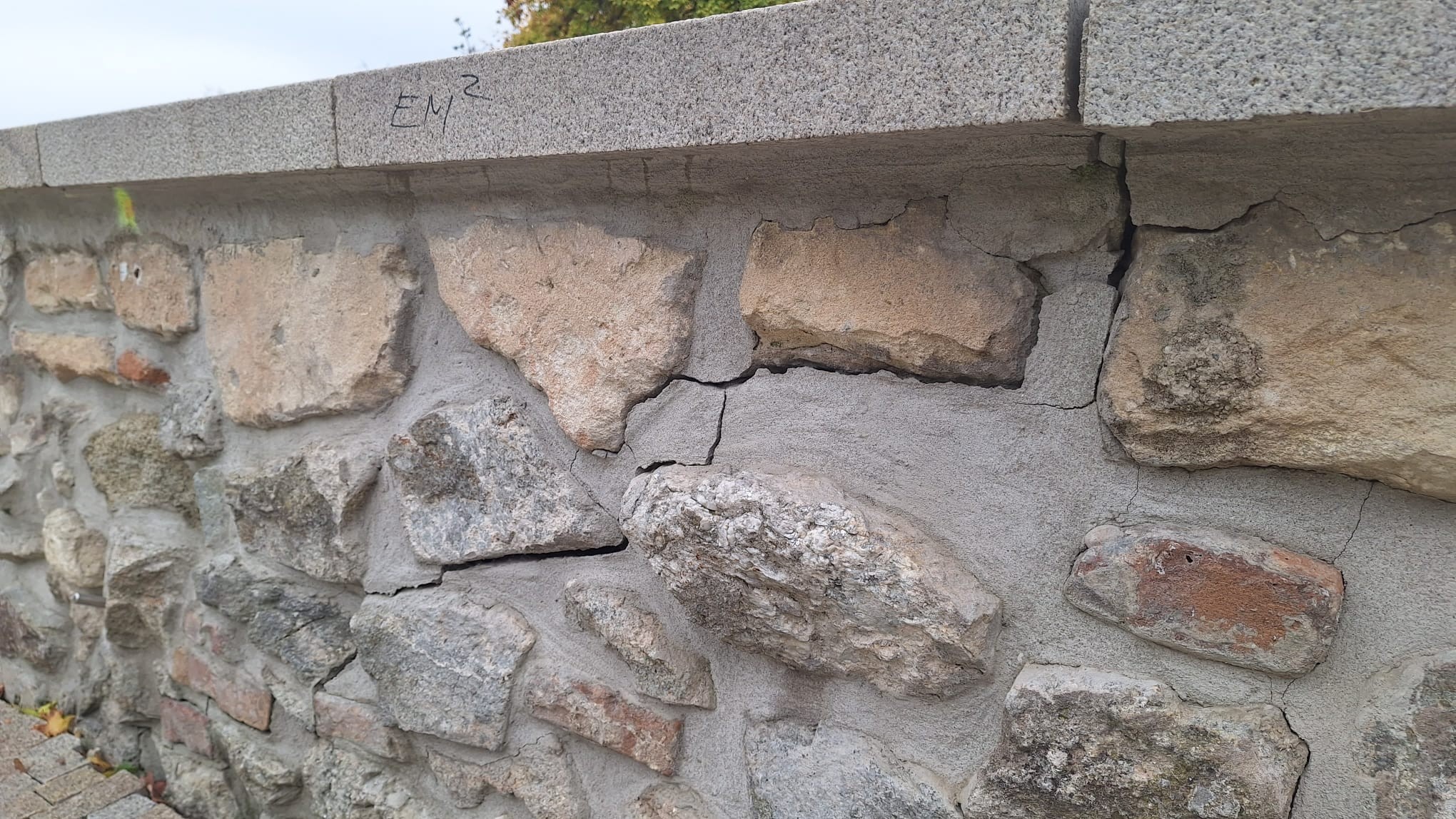 Medzi nakloneným múrom a chodníkom je už medzera.