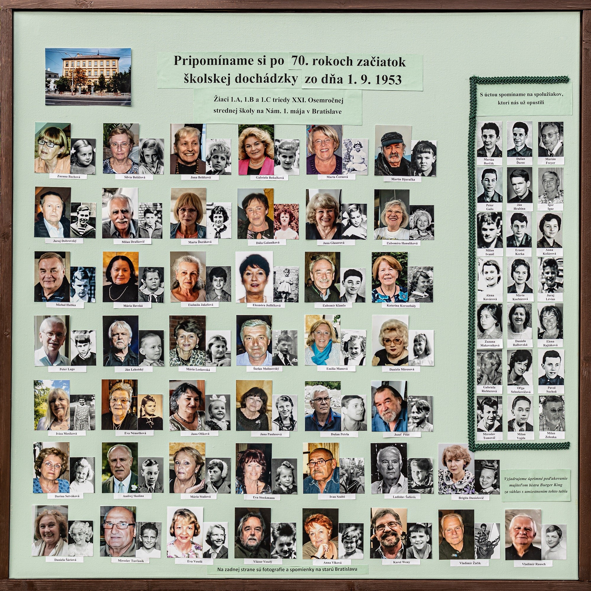 V centre Bratislavy na Laurinskej ulici, vo výklade bistra Burger King, môžete po tieto dni obdivovať výnimočné tablo, ktoré vytvorili spolužiaci z niekdajšej ZDŠ na Námestí 1. mája, narodení krátko po vojne. Priťahuje pozornosť mnohých okoloidúcich, niektorí objavujú na fotkách svojich príbuzných, ale aj viaceré známe tváre. Foto tabla nájdete v článku nižšie - koho poznáte vy?