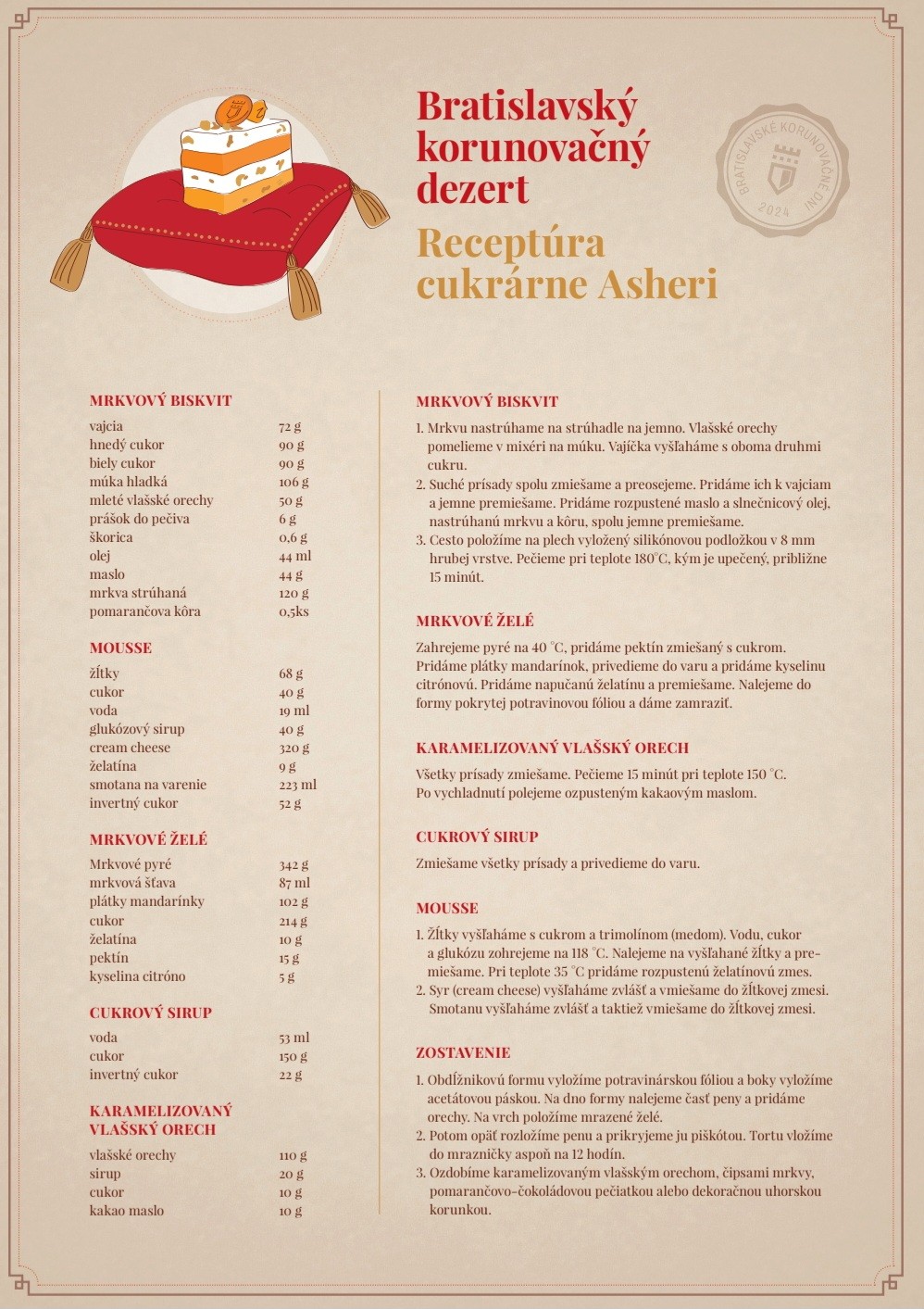Bratislavský korunovačný dezert pre tento ročník korunovačných dní sa skladá z mrkvového biskvitu, mousse, mrkvového želé, cukrového sirupu a karamelizovaného vlašského orechu. Jeho vrch je zdobený čipsami z mrkvy, pomarančovo-čokoládovou pečiatkou mesta alebo dekoračnou uhorskou korunkou. Jeho základ je spojený s tradíciou medovníka, keďže súčasťou korpusu sú tiež orechy či med, kombinácia mrkvy a mandarínky zároveň podľa Greža dotvára zaujímavú chuť.