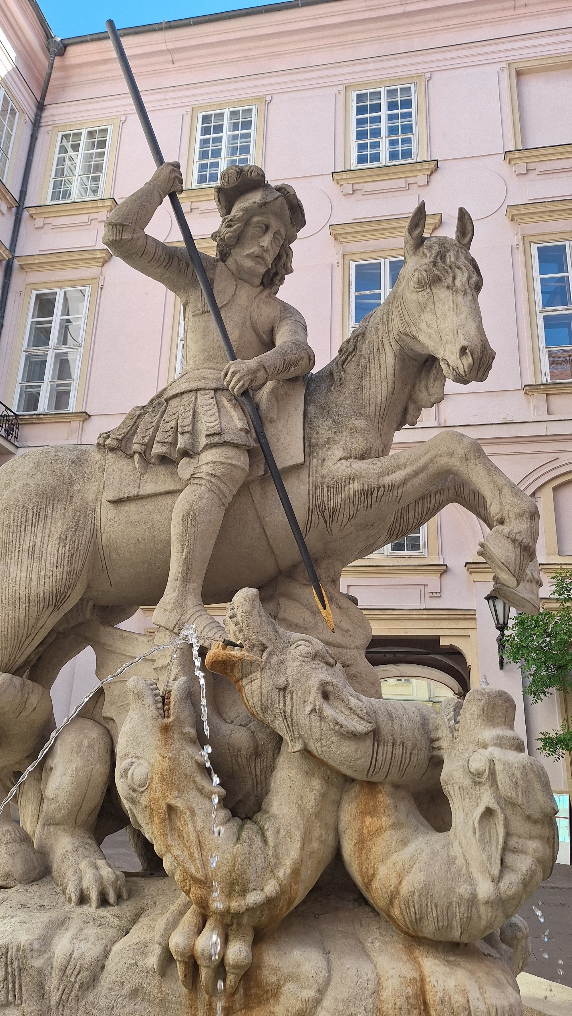 Udatného rytiera sediaceho na koni, ktorý kopijou prebodáva trojhlavého draka, nájdete na nádvorí Primaciálneho paláca. Súsošie je ozdobou Fontány svätého Juraja a vzniklo približne v roku 1650 v dielni neznámeho sochára. Pôvodne išlo o fontánu v záhrade letného arcibiskupského paláca, keď sa však koncom 19. storočia rušila výzdoba záhrady, fontána sa dostala do súkromnej meštianskej záhrady. Umelecké dielo daroval v roku 1929 obchodník Rudolf Wahl mestu, ktoré ho umiestnilo do súčasnej lokality s novou vodnou nádržou.