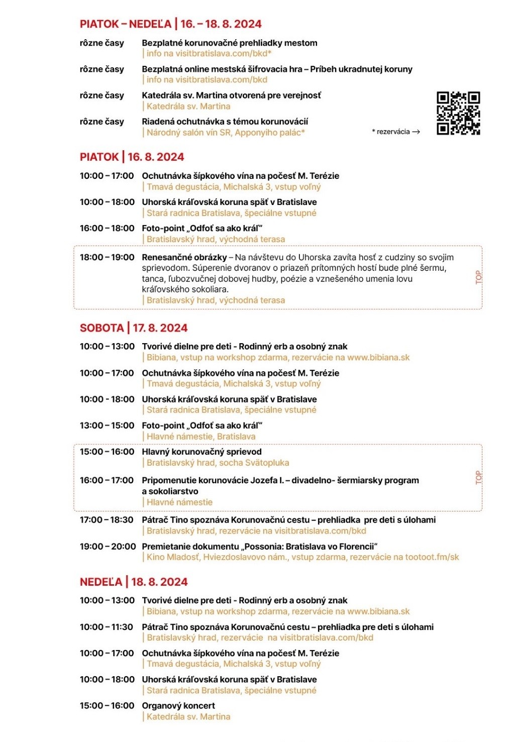Trojdňové podujatie Bratislavské korunovačné dni sa začína už dnes, 16. augusta, a až do nedele, 18. augusta, ponúkne bohatý program, ktorý pripomenie slávnu korunovačnú históriu Bratislavy.