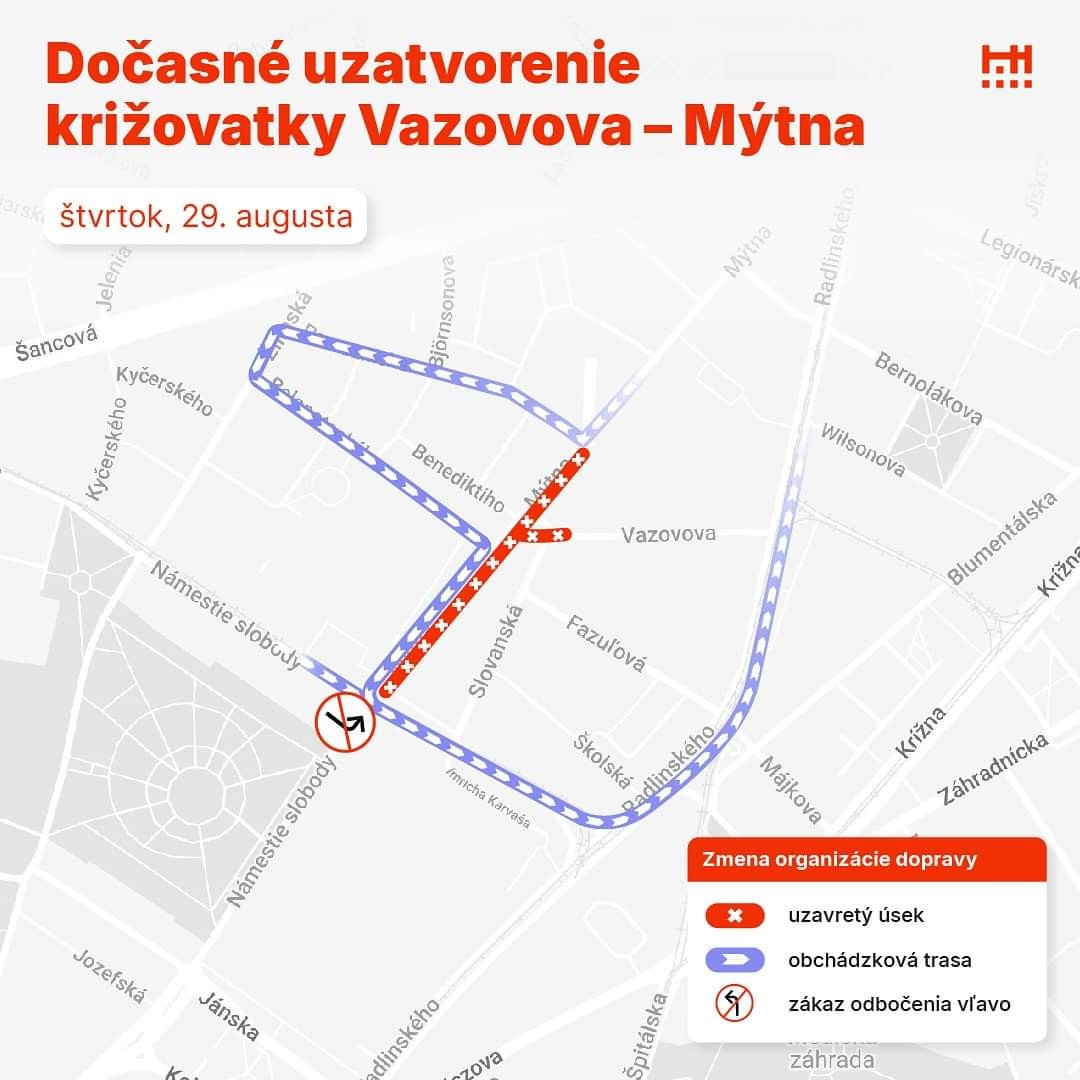 "Vozidlá MHD, ktoré premávajú po Mýtnej, budú odklonené po vedľajších uliciach. Uzávera sa dotkne trasy linky 39 v smere Cintorín Slávičie, ktorá neobslúži zastávky Račianske mýto (G) a Povraznícka (A). Na odklonenej trase linka 39 obslúži zastávky Račianske mýto (J) na ulici Legionárska a zastávku Blumentál (A) - zastávka linky 31 smer Cintorín Slávičie. V smere Súhvezdná bude linka 39 premávať bez zmeny," spresnilo hlavné mesto na sociálnej sieti.