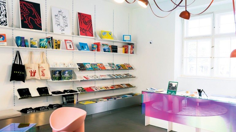 Nájdete v ňom najmä publikácie MMB, ale aj rôzne iné knihy, zamerané na súčasné mestské a spoločenské témy. Nechýbajú ani drobné suveníry z produkcie múzea a ďalších lokálnych značiek, ako záložky, tričká či upcyklované obaly a tašky z bannerov MMB, ktoré vznikli v rámci spolupráce s kaviarňou Radnička a jej chránenou dielňou.