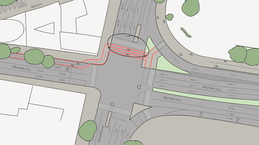 V pláne je aj vybudovanie nového priechodu pre chodcov na Karadžičovej smerom k nákupnému centru Mlynské Nivy.