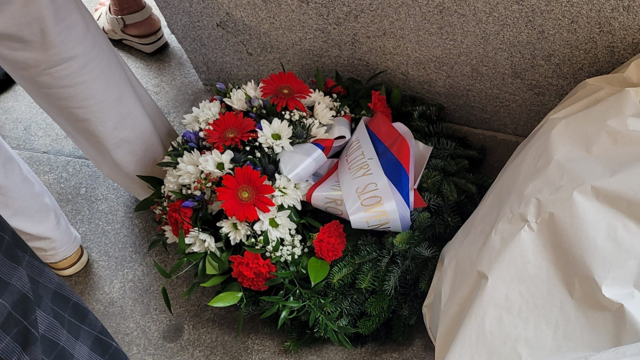 Nepoložený veniec Ministerstva kultúry SR odložený na schodoch pod nohami okolostojacich.