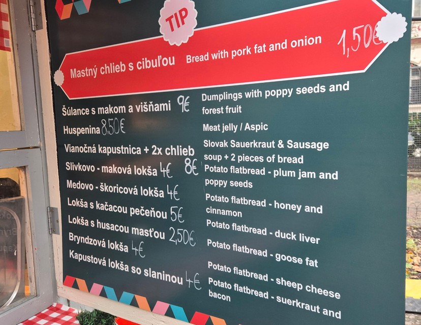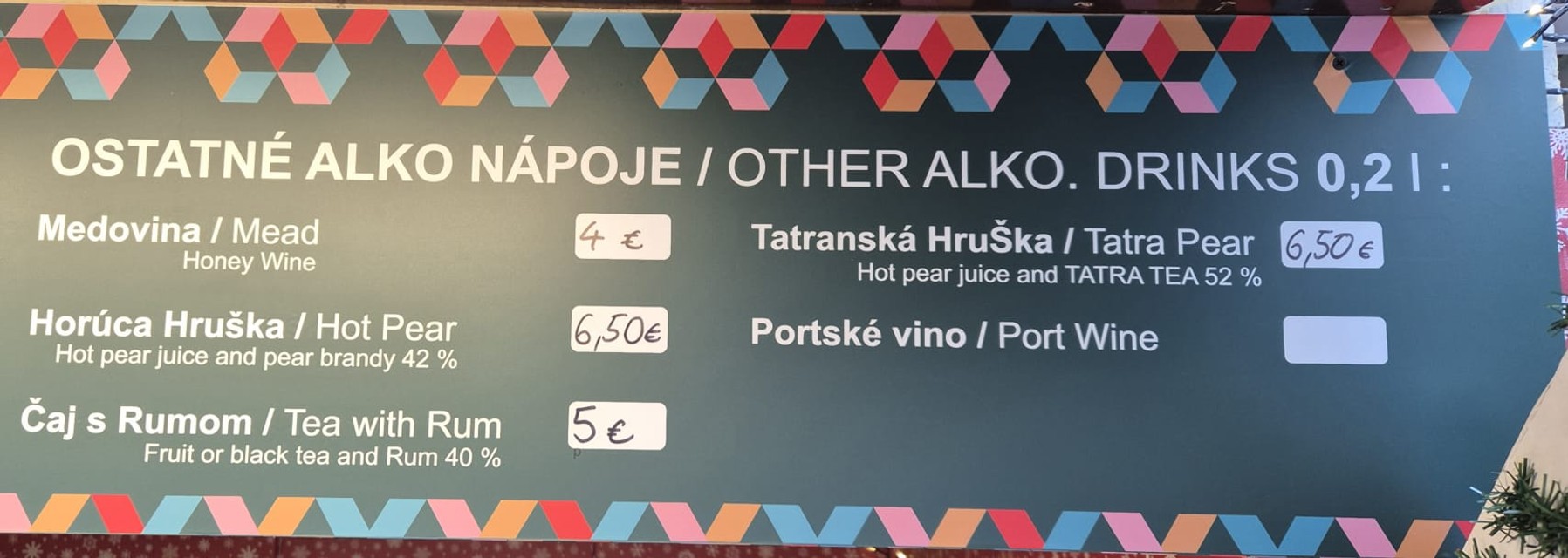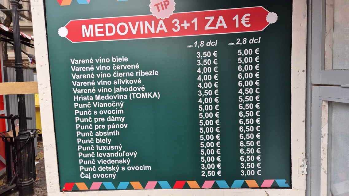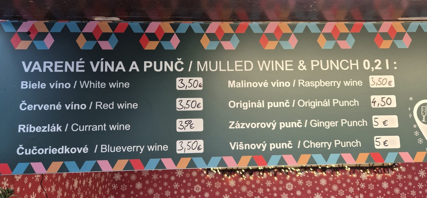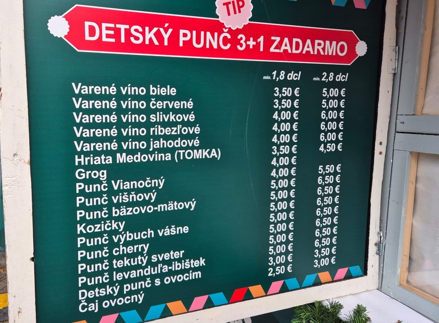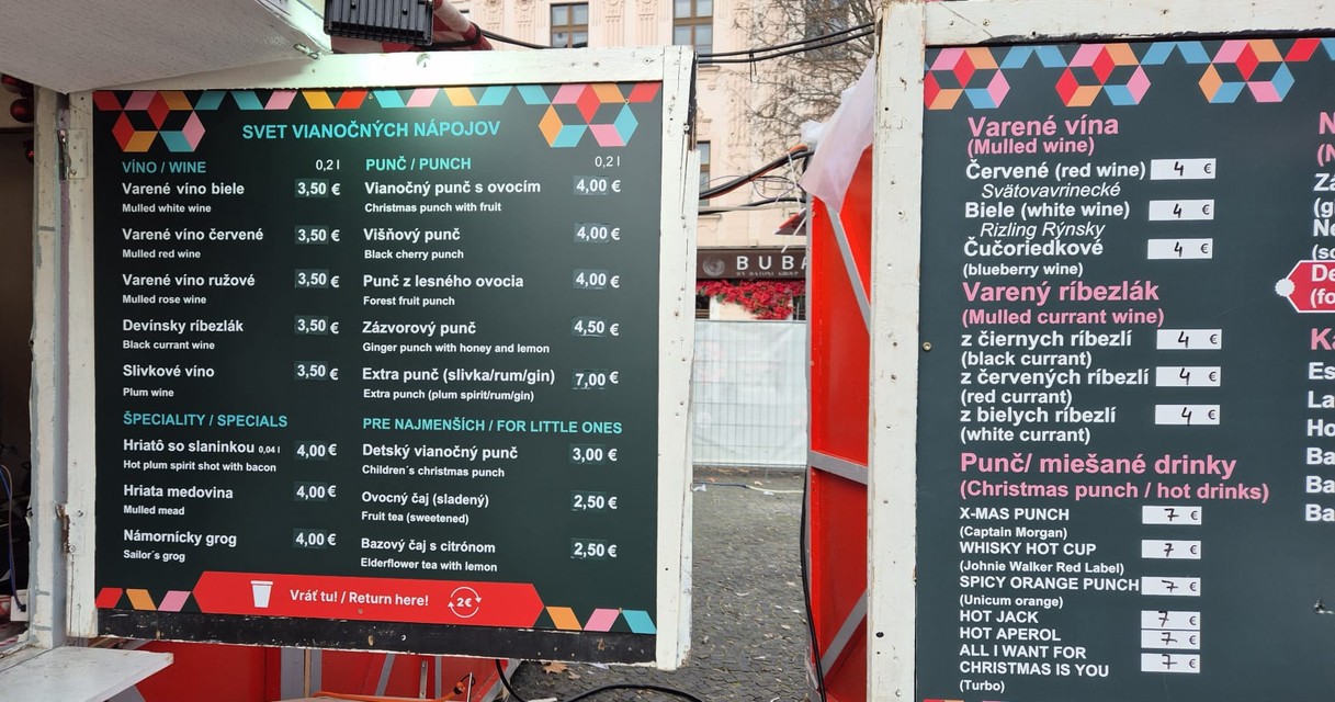 Ceny sú tu pochopiteľne prakticky rovnaké ako na Hviezdoslavovom námestí. Varené víno (2dcl) kúpite za 3,50, punč či medovinu za 4 eurá, za mastenú lokšu dáte 2,50, langoš sme videli za 5,50 (s cesnakom) aj za 8,50 eura (so syrom a kečupom). Za zemiakovú placku bez prílohy zaplatíte 6,50 eura, placka s bryndzou, slaninkou a cibuľkou stojí už 11.