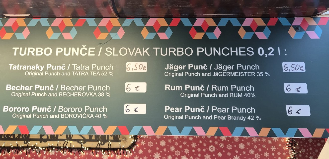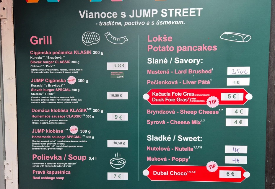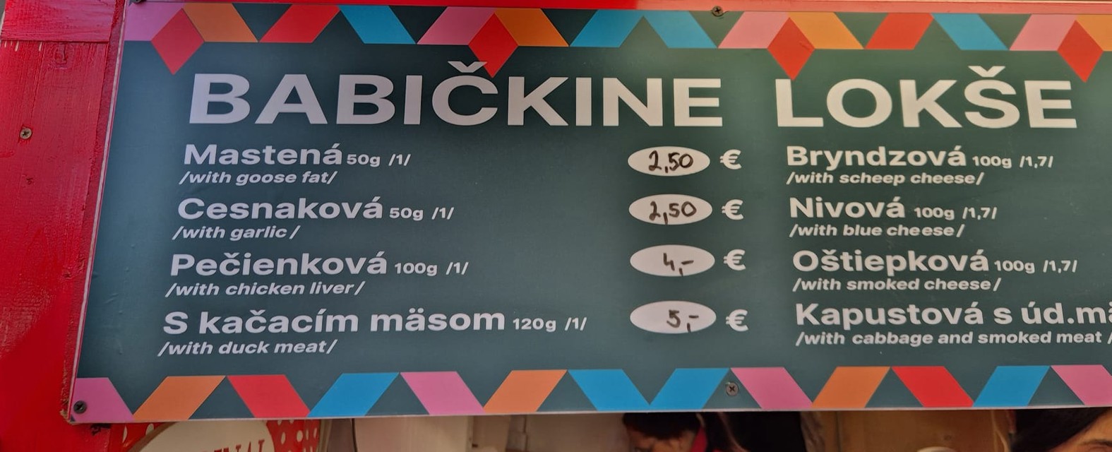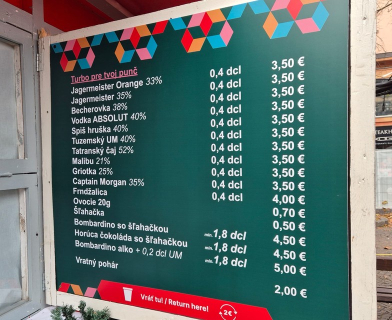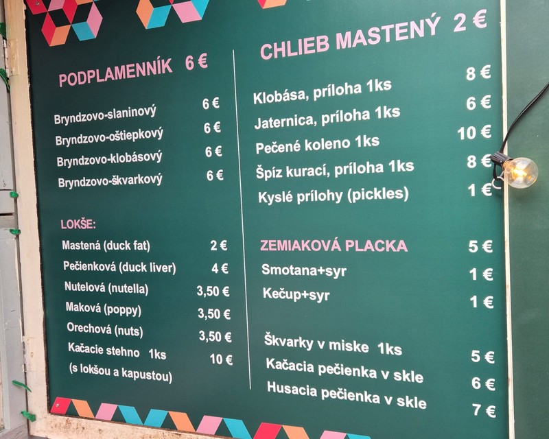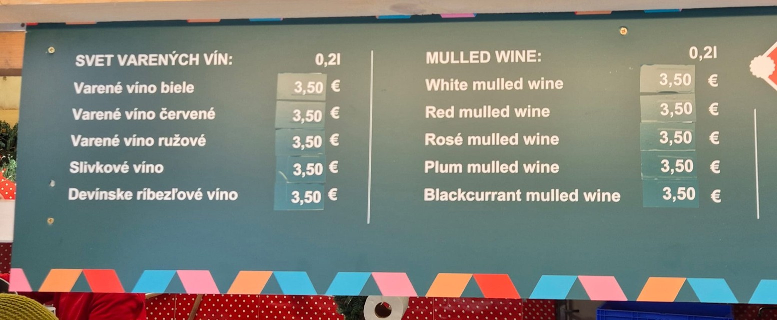 Ceny sú tu pochopiteľne prakticky rovnaké ako na Hviezdoslavovom námestí. Varené víno (2dcl) kúpite za 3,50, punč či medovinu za 4 eurá, za mastenú lokšu dáte 2,50, langoš sme videli za 5,50 (s cesnakom) aj za 8,50 eura (so syrom a kečupom). Za zemiakovú placku bez prílohy zaplatíte 6,50 eura, placka s bryndzou, slaninkou a cibuľkou stojí už 11.
