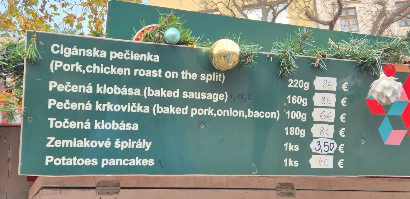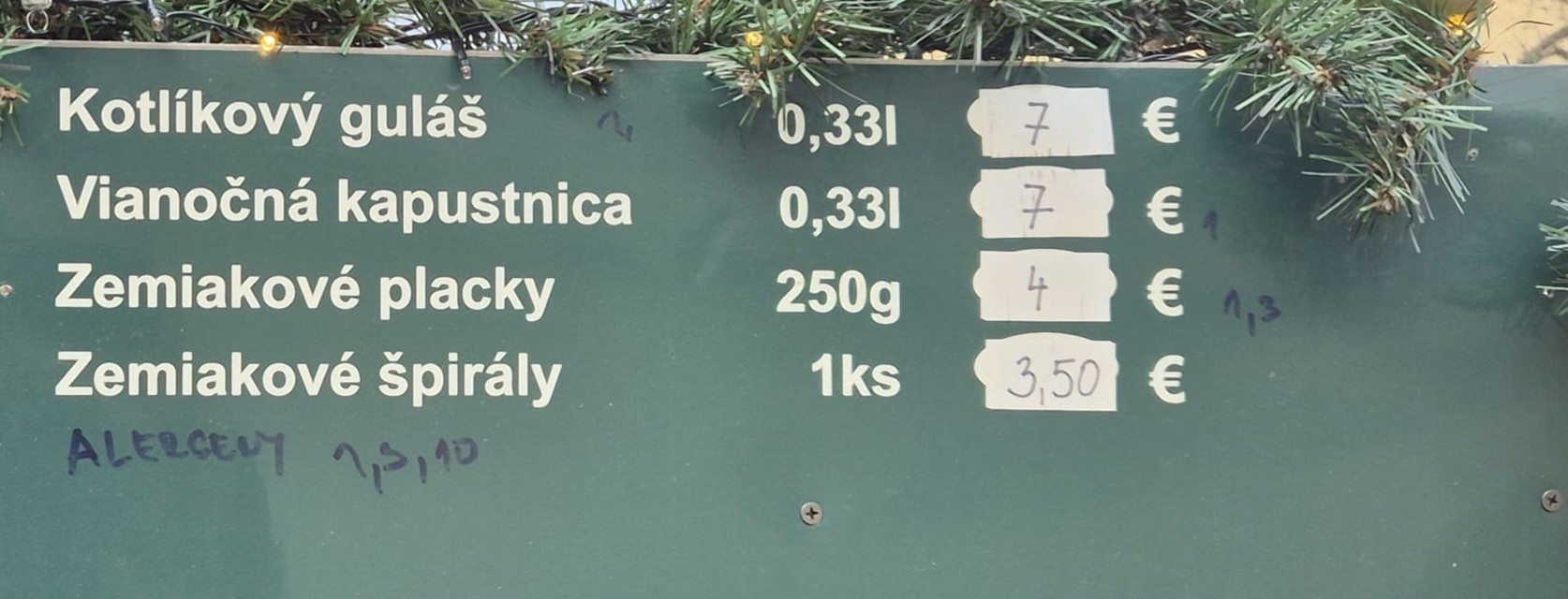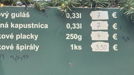 Trhmi sme sa prešli, za cigánsku pečienku či klobásu dáte cca 8 eur, za jednu mastenú lokšu bez prílohy 2 eurá, za plnenú pečienkou už 5 eur, guláš či kapustnica vás vyjdú na 7 eur, za dva deci vareného vína zaplatíte 3,50 - 4 eurá, podobne vás vyjde medovina či punč.
