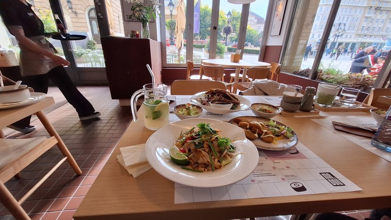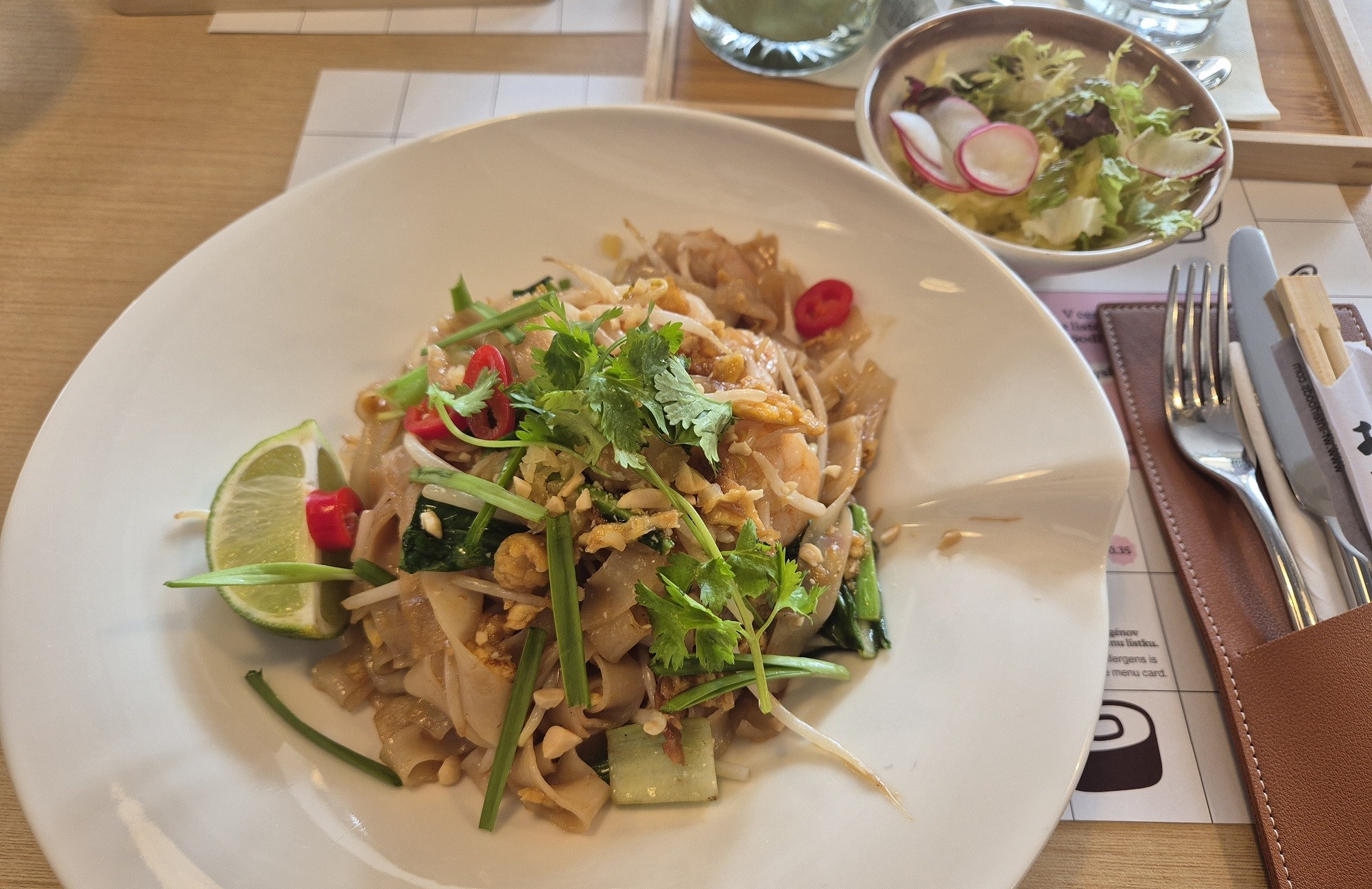 Pad Thai s krevetami je ikonické thajské jedlo so širokými ryžovými rezancami, ktoré sa restujú vo woku spolu s ďalšími ingredienciami a dochutia dresingom z tamarindu, rybej omáčky a cukru. My sme v nich mali napríklad kúsky omelety, citrónovú trávu, chrumkavé klíčky fazule mungo, dokonca aj pár kúskov čili papričky, ak by mal niekto chuť na pikantné. Pozitívne nás prekvapilo množstvo kreviet. Jedlo bolo výborné, potrebovali sme si ho však trošku dosoliť, lebo prevládali sladké tóny, ale to už je na osobných preferenciách každého.