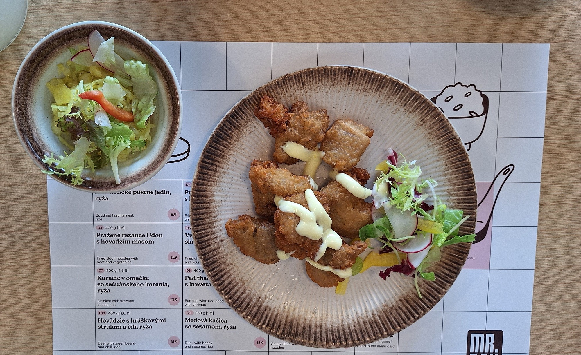 Vyskúšali sme aj ďalšie predjedlo, a to Japonské vyprážané kura Karaage (7,90 €). Vyprážané kúsky vyzerali zvonka ako naše klasické kura, ale chuť bola úplne iná. Mäso sa totiž najskôr marinuje v zmesi, ktorej základom je sójová omáčka, potom sa obalí v zemiakovom škrobe alebo pšeničnej múke, a napokon sa vypráža v oleji. Bolo výborné, šťavnaté, malo ďaleko od nášho vyprážaného kurčaťa, ktoré býva hutné a suché. Toto bola príjemná zmena, užili sme si aj chrumkavý obal, ktorý ničím nepripomínal naše trojobaly.