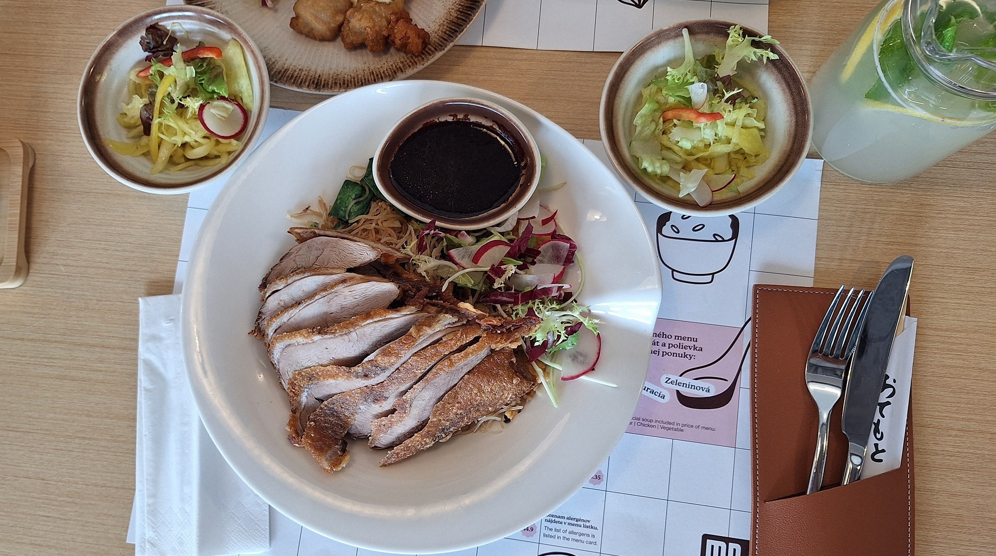 Porcia tenučkých plátkov kačacieho mäsa bola ako pre dvoch, rovnako to platí o rezancoch uložených pod nimi. Jemné mäsko s neskutočne chrumkavou kôrkou (kožu špeciálne upravujú, sušia aj glazujú) bolo šťavnaté a voňavé, plné chutí rôznych cudzokrajných korenín, ktoré doma nedokážeme vymyslieť. Rovnako znamenité boli cestoviny zasypané čerstvou zeleninou, zaujala aj slivkovo-sójová omáčka v malej miske. Bola hutná a slaná, zároveň trochu sladká a chuťovo výrazná až tak, že sme si z nej brali opatrnejšie, aby nekonkurovala dokonale ochutenej kačke. K nej sa nám celkom hodil šalát - mix čerstvej a nakladanej sladkokyslej zeleniny, ktorý nám priniesli ešte pred polievkou. Oplatilo sa počkať s ním na tento finálny gurmánsky zážitok.