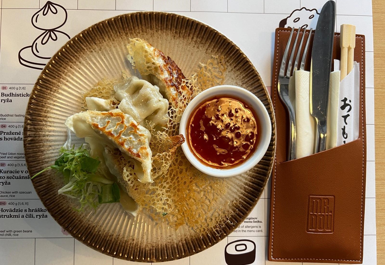 Príjemne nás naladilo už predjedlo „Gyoza“ zapekané taštičky plnené kuracím mäsom (6,90 €), čo je populárna japonská špecialita, jej pôvod je však čínsky. Tenké cesto plnené mletým kuracím mäsom bolo skôr naparené, len spodok opečený, a chuť jemná, bez potreby pridať soľ. K tomu sme mali v miske sweet chilli omáčku a trochu čerstvej zeleniny, no ale najviac zaujala chrumkavá „čipka“, ktorá zdobila taštičky. Naša japonská kamarátka Mariko priznala, že u nich doma jej takto gyozu ešte nenaservírovali, a tak sme konzultovali s AI. Tvrdí, že chrumkavý element sa tvorí zo zmesi vody a škrobu alebo múky, podobne ako francúzske tuile, a že náš tanier prezentoval typické moderné servírovanie. Aj keď „čipka“ nemala nijakú výraznú chuť, chutila nám jej chrumkavosť, už len pre ten pocit v ústach.