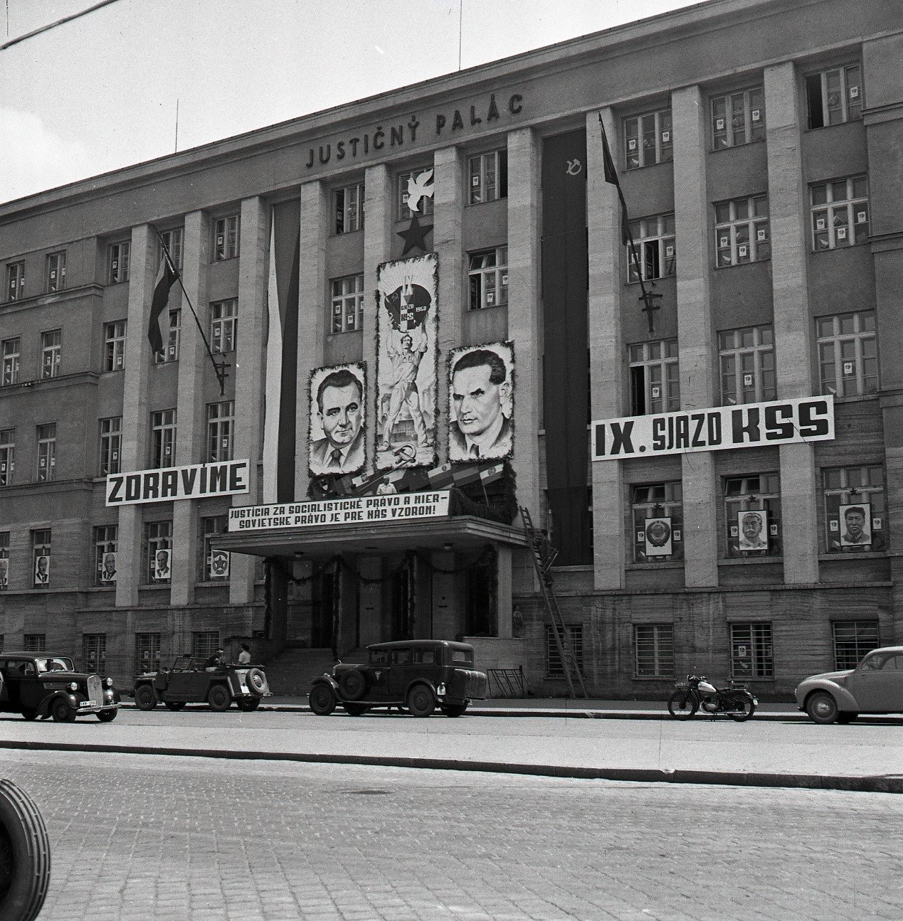 MÁJ 1950, transparent na fasáde Justičného paláca s heslom Justícia za socialistické právo a mier...