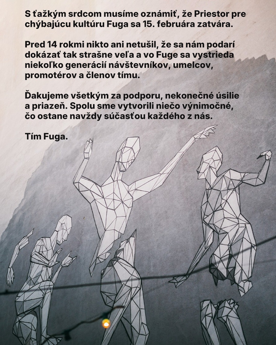 "S ťažkým srdcom musíme oznámiť, že Priestor pre chýbajúcu kultúru Fuga, sa zatvorí 15. februára," uviedol tím podniku na sociálnej sieti.