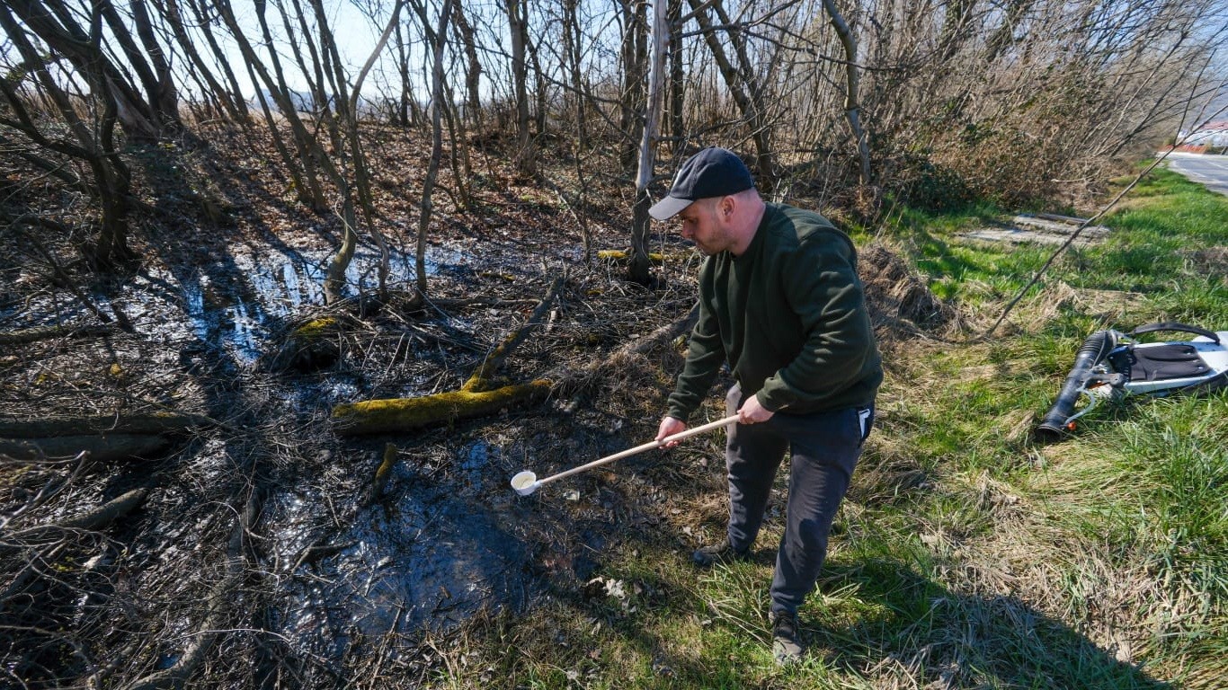 Monitoring liahniska komárov. Skontroluje sa voda v naberačke, či sa v nej už nachádzajú larvy.