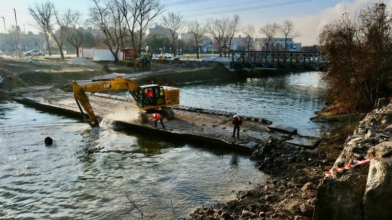 Uplynulý týždeň sa objavil uprostred Malého Dunaja te bager. Prebiehali tu práce na odstránení zvyškov základov pôvodného premostenia, a tak bagre priamo z pontónového mosta odstraňovali z dna kusy niekdajších pilierov.