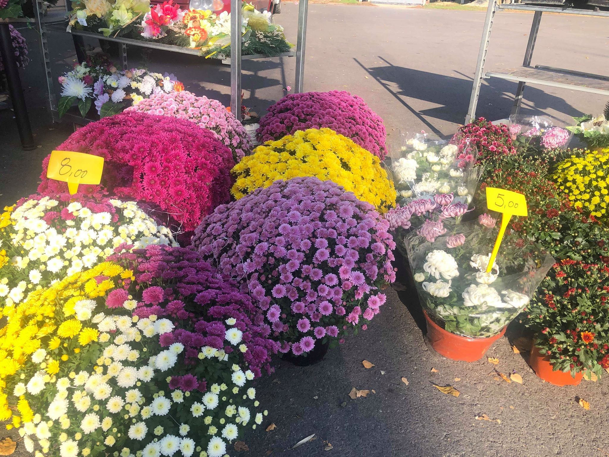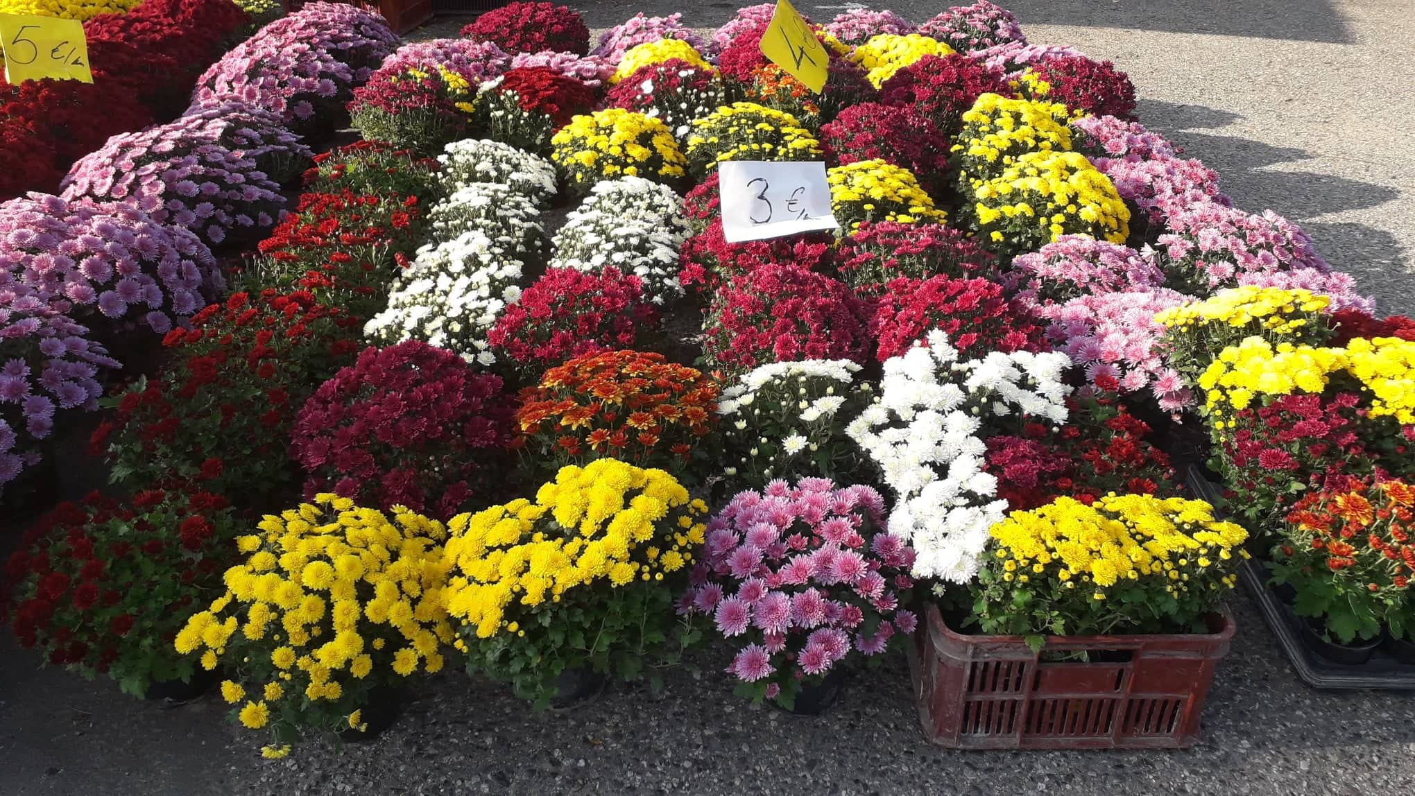 Chodník popri hlavnej ceste doslova lemovali pestrofarebné chryzantémy či astry v kvetináčoch, rezané kvety do vázy i sušené kvety, vence a rôzne aranžmány z prírodných aj umelých kvetov... Ďalšie ponúkajú predajcovia pri bráne, a, samozrejme, kúpite v kvetinárstve v areáli cintorína. Vyberať teda naozaj je z čoho, oplatí sa však najskôr si pozrieť ponuku viacerých predajcov, aby ste zbytočne nepreplatili. Napríklad astry v kvetináči vám predajú za 3 eurá, ale aj za 4,50 eura, za chryzantémy v kvetináči si od vás vypýtajú 4 eurá aj 8 eur, záleží na veľkosti.