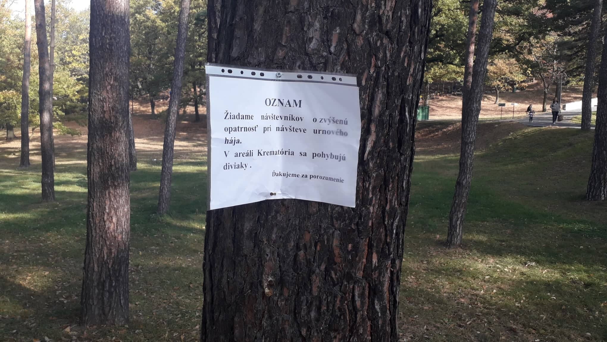 Na začiatku cestičky do urnového hája nás upútalo varovanie pripevnené na strome, že v areáli krematória sa pohybujú diviaky. „No zbohom,“ reagovala pani, ktorá nás poprosila, aby sme jej oznam prečítali, vraj naň dobre nevidí (napísaný je totiž na hárku papiera, ktorý treba najskôr vyrovnať, ak ho chcete čítať).
