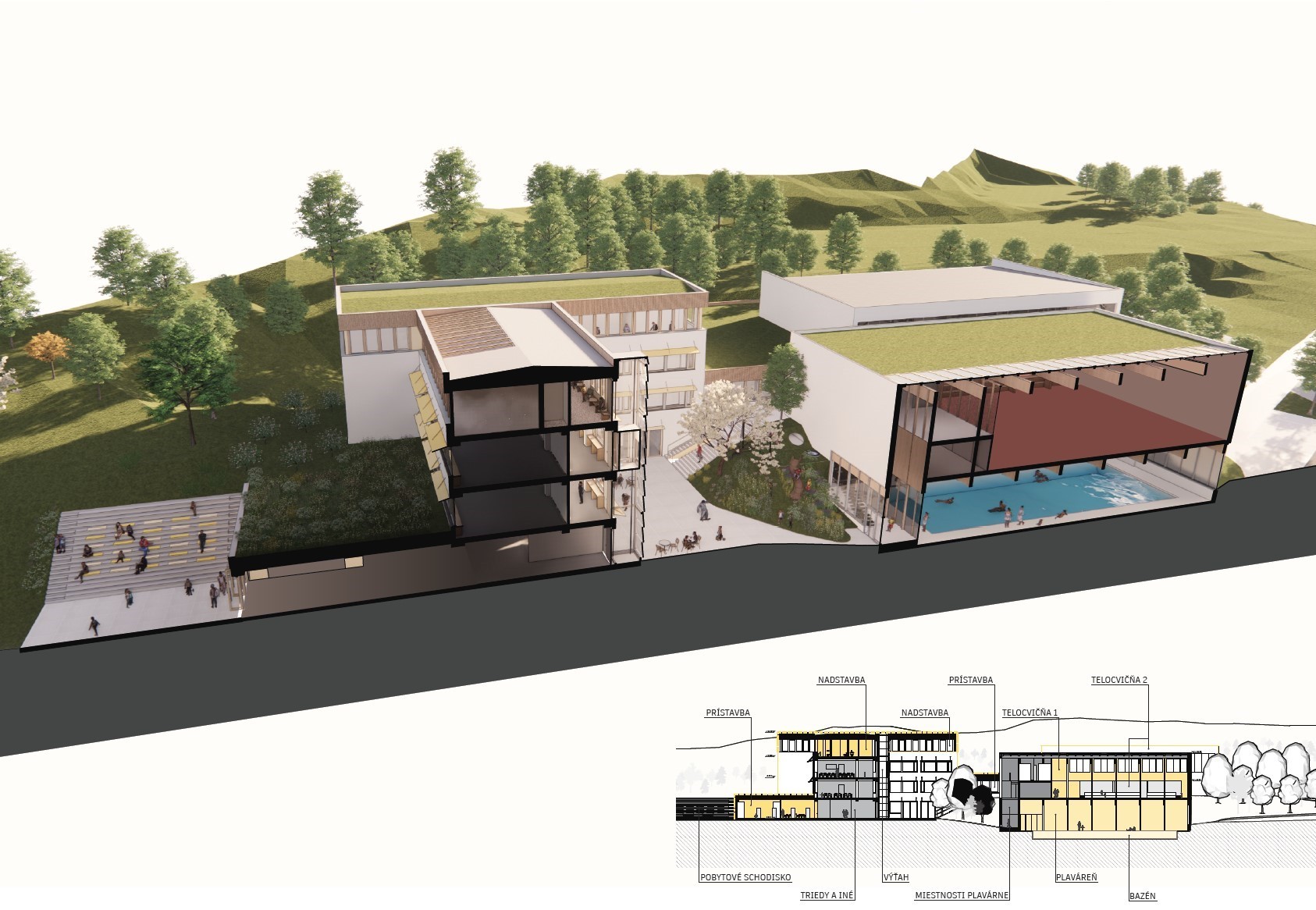 Zrekonštruovať by sa mala pôvodná veľká telocvičňa a k nej by mala pribudnúť aj ďalšia malá telocvičňa v novej prístavbe. „Návrh prístavby obsahuje okrem malej telocvične, herne a malého štúdia aj bazén s veľkosťou 25 metrov a v šírke 4 dráh, ktorý by mohol slúžiť na plavecký výcvik žiakov a mimo vyučovania aj pre verejnosť, nakoľko je navrhnutý ako prevádzkovo nezávislý objekt od zvyšku školy. Rekonštrukcia objektov počíta s ekologickými prístupmi, zelenými strechami, s hladkými povrchmi a akustickými stropmi, s priestranným skladom bicyklov a vytvorením exteriérových športových plôch pre školákov,“ doplnil starosta Jozef Krúpa.