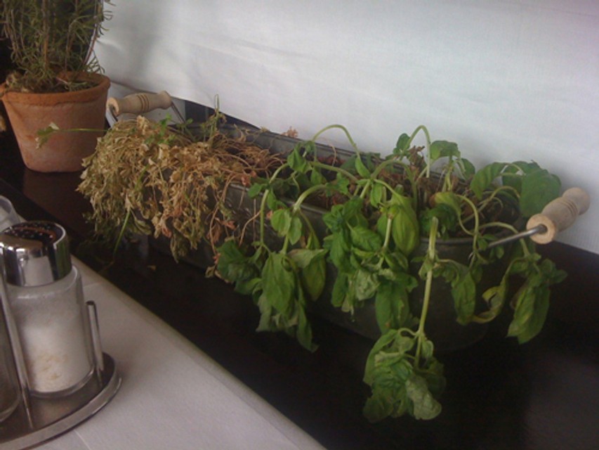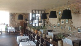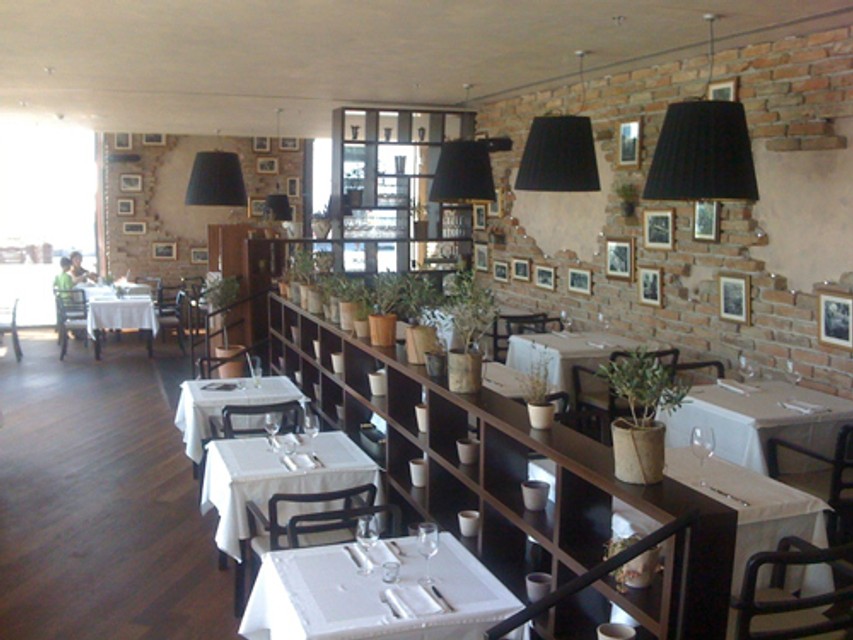 Interiér má pôsobiť trochu vidiecky -steny sú obložené odhalenými tehlami, na nich sú staré fotografie talianskeho trhu v zlatých rámoch. Drevená je podlaha aj mobiliár - elegantné stoličky sú z ohýbaného dreva, časť reštaurácie je na vyvýšenom pódiu oddelenom drevenou policovou zostavou. Zo stropu visia lustre s mohutnými čiernymi plátennými tienidlami. Zo strany námestia je letná terasa, viac stolov je však na neďalekom vyhliadkovom móle. Na stoloch a v policiach sú kvetináče s bylinkami - v niektorých prípadoch zvädnutými.