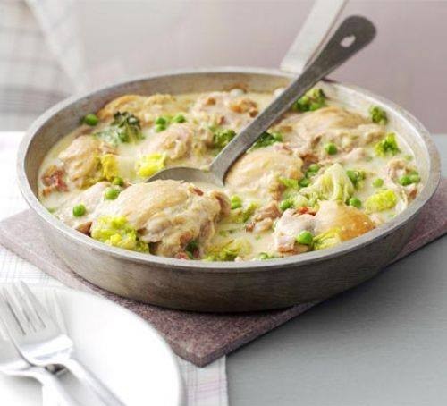 Slaninu nakrájame na kocky a dáme do panvice. Na miernom ohni opekáme, kým nepustí tuk a nechytí hnedastú farbu. Slaninu vyberieme, ale tuk necháme v panvici. Pridáme kuracie stehná a opečieme do zlatista z každej strany. Pridáme cesnak, najemno nakrájanú jarnú cibuľku a opekáme asi 30 sekúnd, aby mala cibuľka stále zelenú farbu. Zalejeme vývarom, pridáme slaninu a varíme na miernom ohni 15-20 minút. Po 20 minútach zvýšime teplotu, do panvice pridáme hrášok a varíme ďalších 4 až 5 minút. Skontrolujeme či je kura celé uvarené. Pred podávaním pridame „cr?me fraîche“, zamiešame a cele podávame v hrnci a horúce.