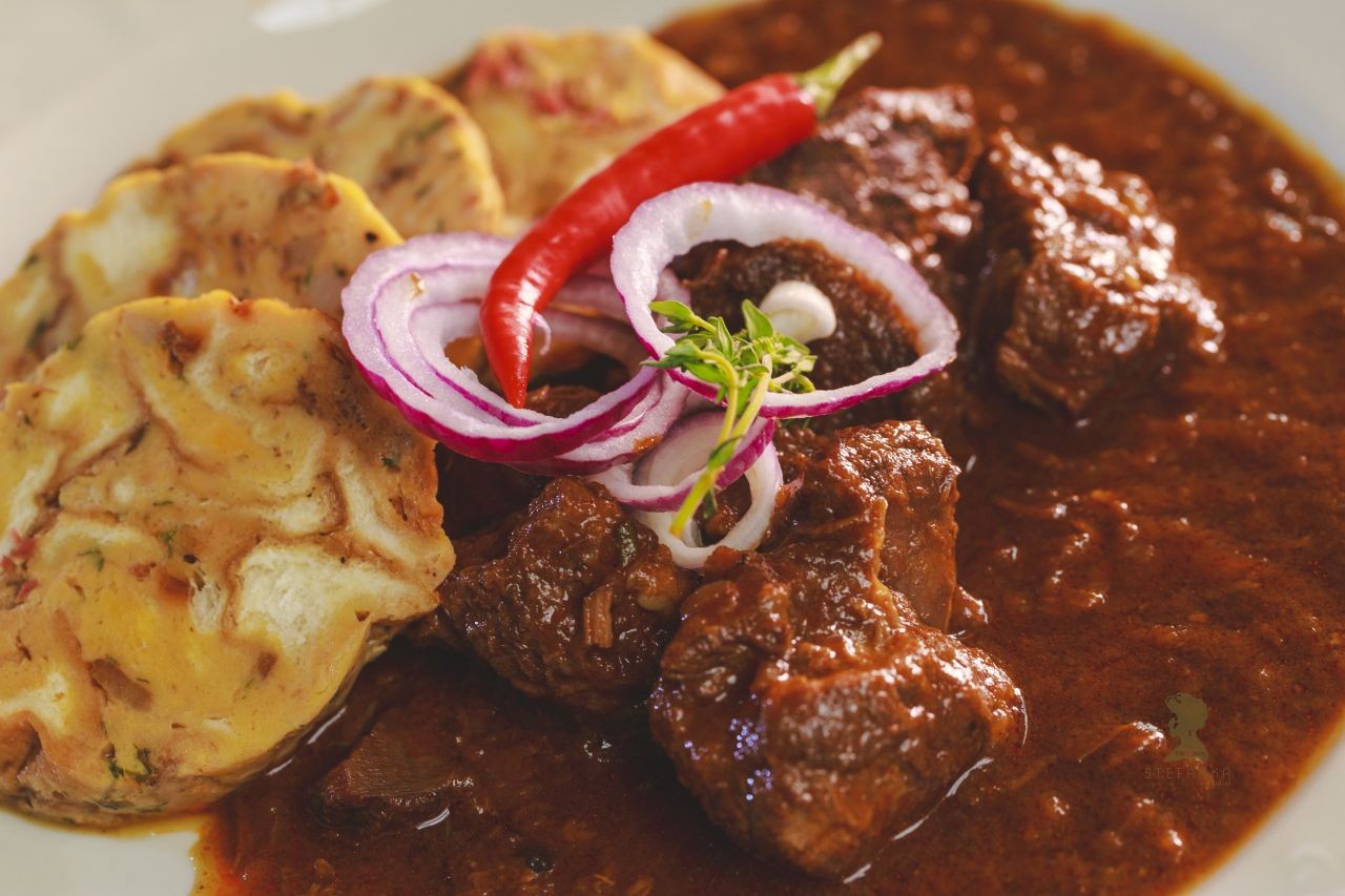 Hlavné jedlo: Divinový guláš STEFANIA zo srnca a diviaka sme dostali bez knedle - iba s varenými zemiakmi