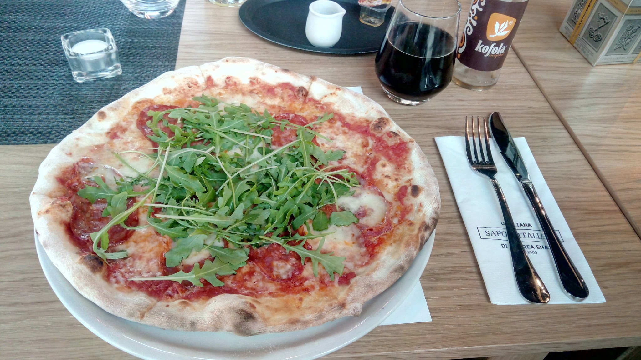 Pochopiteľne sme nemohli odísť bez toho, aby sme ochutnali pizzu, vybrali sme špecialitu podniku U Taliana, ktorú tvorí paradajková omáčka, mozzarella, rukola, cherry paradajky, mozzarella di bufala, a prosciutto crudo, čiže surová šunka (14,90 €/ 510 g). Bola veľmi chutná. Potešilo nás, že sme v jedálnom lístku talianskej reštaurácie nenašli Pizzu Hawai, ktorá rozhodne nepatrí do talianskej kuchyne. Vymyslel ju totiž kanadský Grék a nemá s Talianskom spoločné nič. Aj keď v Ružomberku vyšiel Talian chutiam „gurmánov“ vyšiel v ústrety.