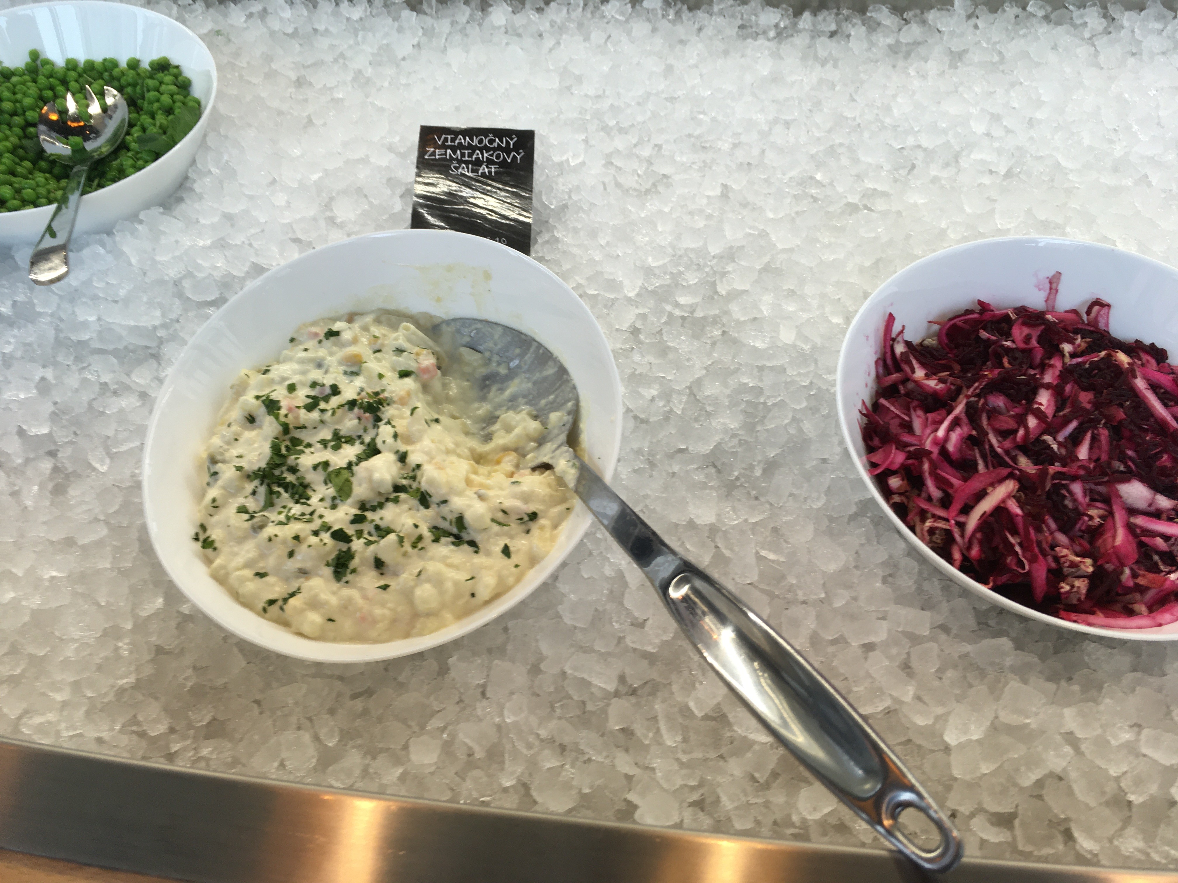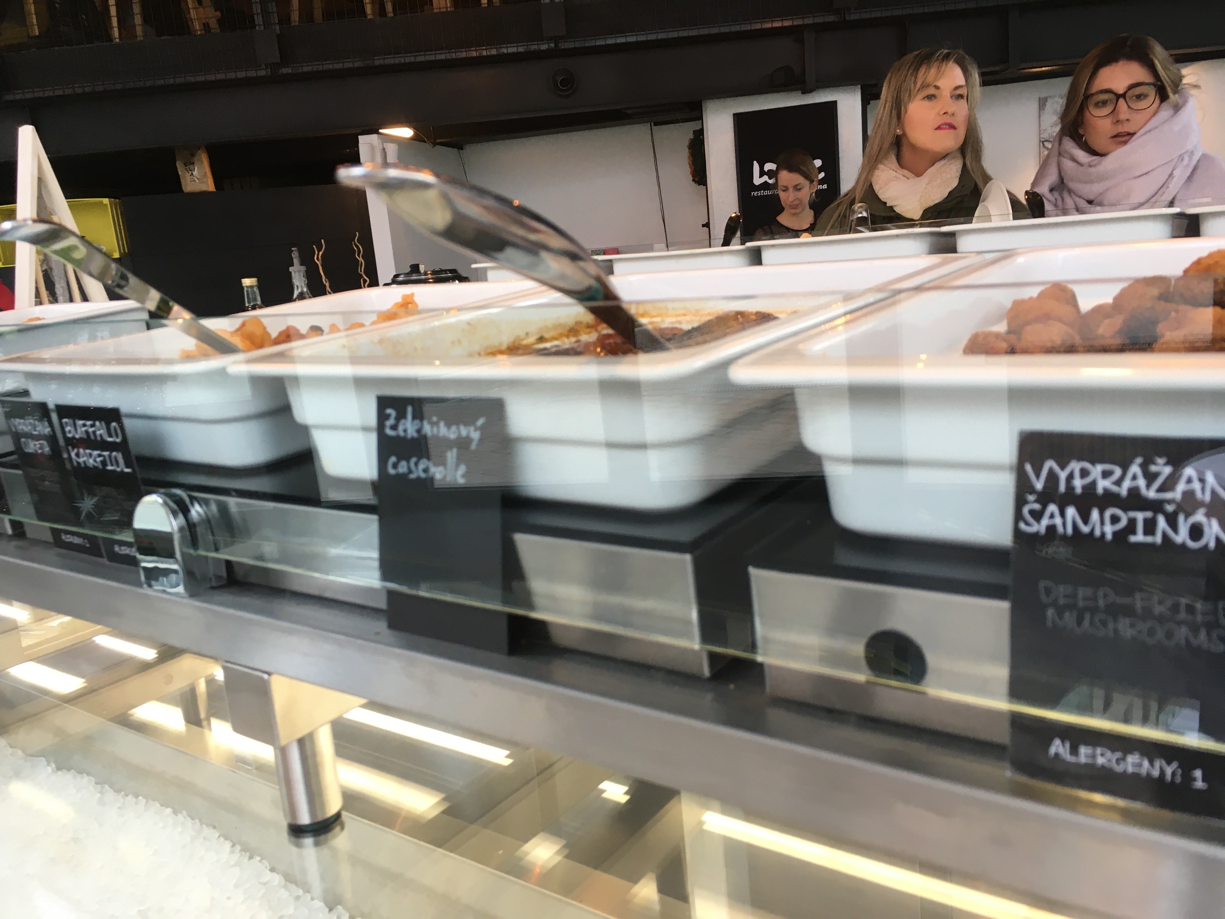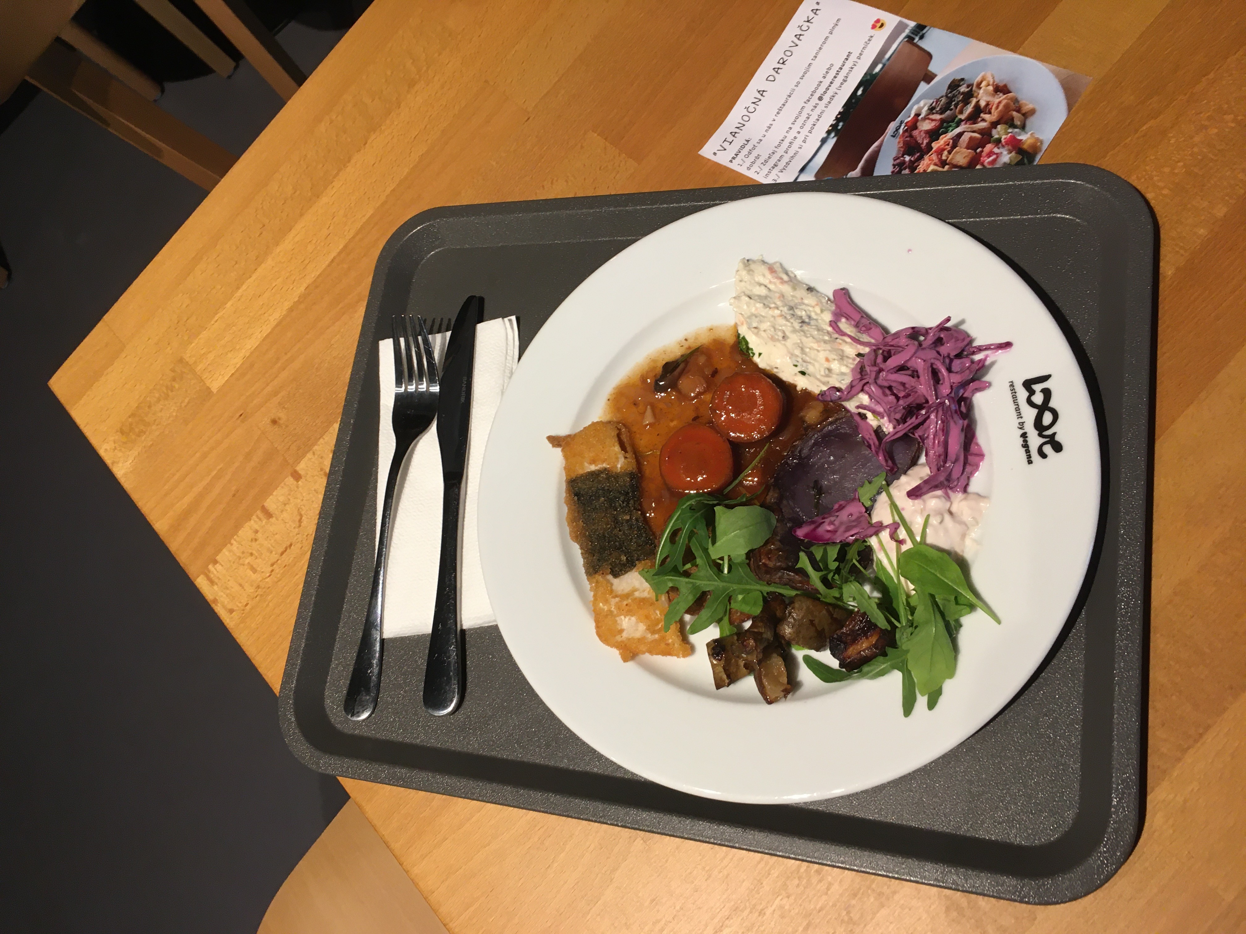 Keďže sme prišli pár dní pred vianočnými sviatkami, v ponuke nás neprekvapila kapustnica – bola to však jediná polievka, ktorú mali. Zato výber hlavných jedál, ako aj šalátov, bol pestrý. Samozrejme, vegánskych, hoci názvami chceli mnohé pripomenúť „klasiku" (vreska - vegánska treska, vatarka - vegánska tatarka, rybie filé - zo zeleru...) Pri každom názve jedla bol uvedený aj zoznam alergénov, len pri dvoch omáčkach na označenie akosi pozabudli, rovnako ako na naberačku na špenátové štrúdle, museli sme o ňu požiadať.
