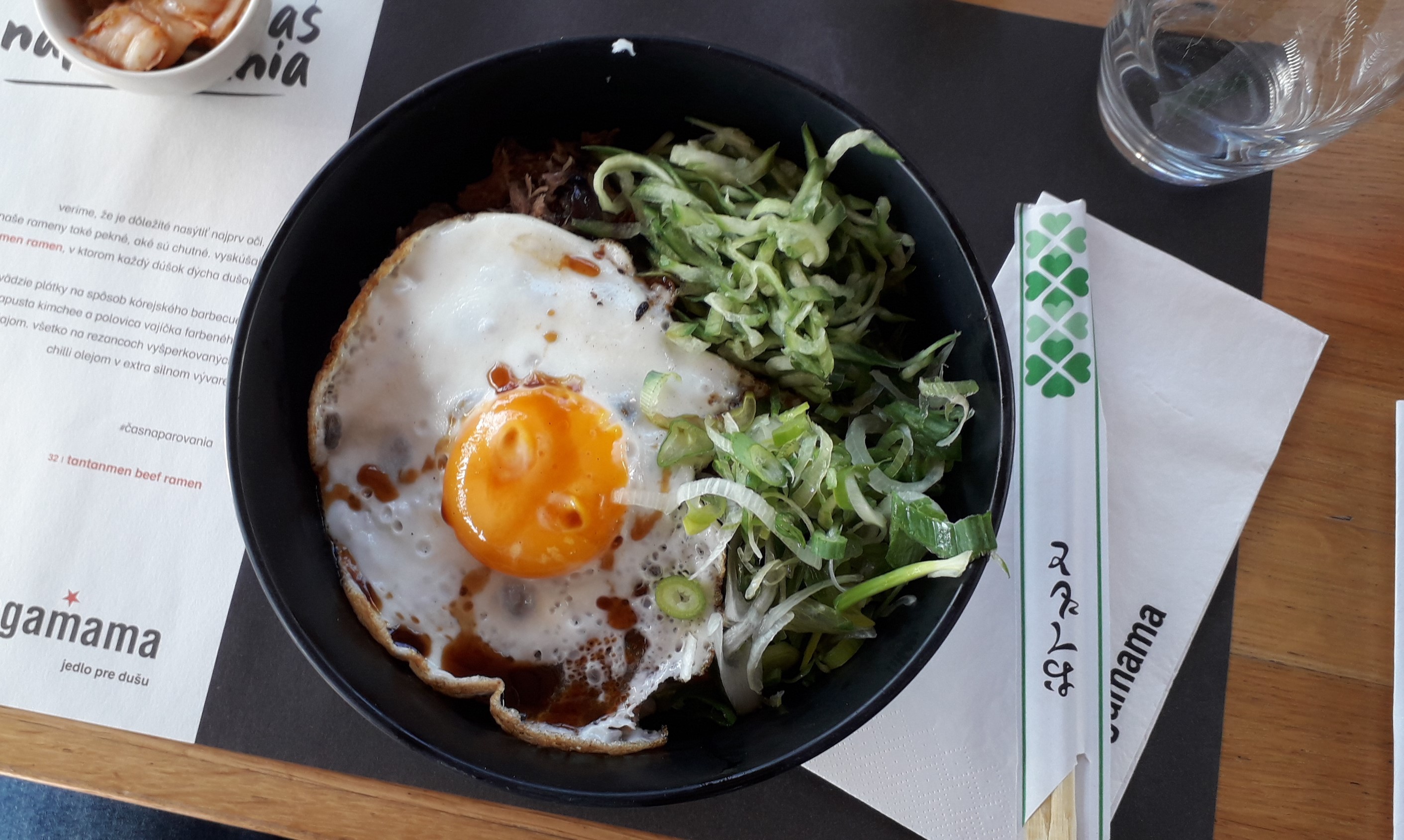 K tradičnému jedlu Grilled duck donburi (13,65 €), čo je miska dusenej ryže s trhaným kačacím stehnom v pikantnej teriyaki a yakitori omáčke, sme mali aj opečené vajíčko.