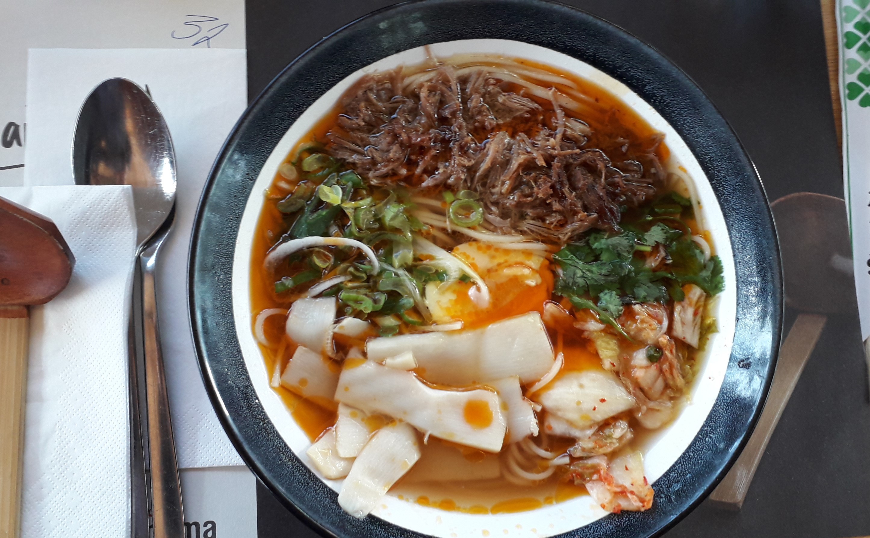 Pozor, Tantanmen beef ramen (11,95 €) je poriadne pikantná polievka, zjavne vďaka pridanému čili oleju a tiež kórejskému kimchee, v ktorom je pálivá červená paprika. V silnom vývare sme mali štedrú porciu trhaného hovädzieho mäsa, plátky bambusu, aj jarnú cibuľku a vajíčko farbené čajom. Ostrá chuť polievky nás síce najskôr zaskočila, no keď sme si „zvykli“, chutila.