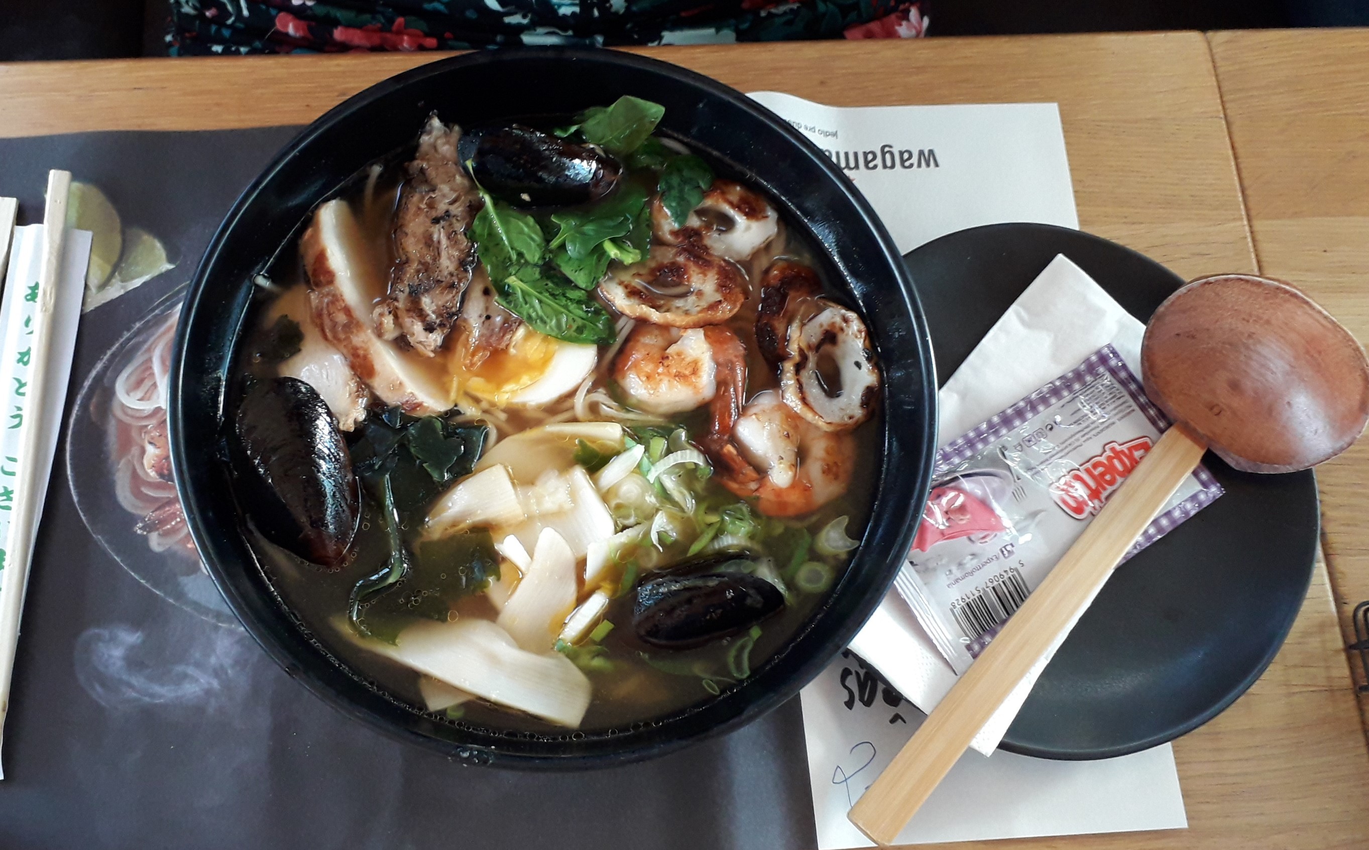 Tradičnú japonskú polievku ramen, ktorej základom je vývar z mäsa alebo kostí a rezance, sme si dali v dvoch verziách. Vo Wagamama ramen (13,65 €) bol okrem kuracieho mäsa, kreviet, mušlí a vajíčka farbeného čajom aj plátok pečeného mastného bôčika. Ten nám "nesadol", ale inak bola polievka vynikajúca. Jedli sme ju prvýkrát a určite nie naposledy.