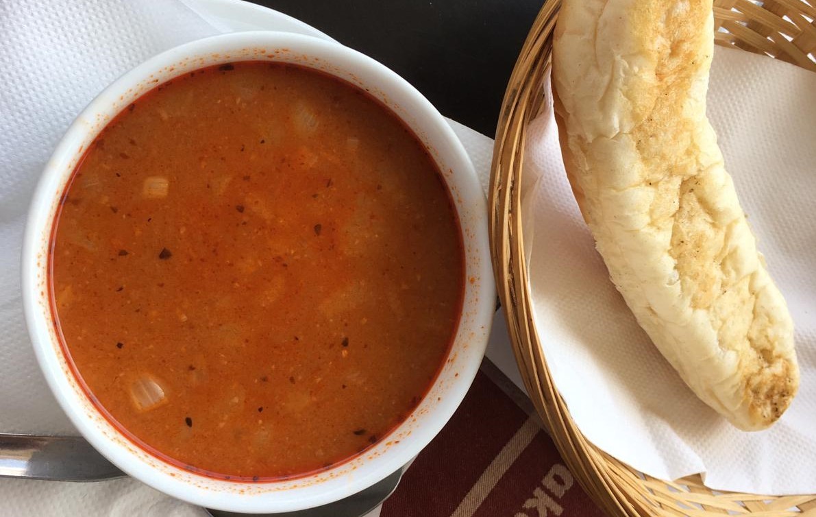Z piatich druhov polievok sme si objednali držkovú (2,70 €) s rožkom (0,30 €). Zjavne ju narýchlo zohriali v mikrovlnke – miska bola síce horúca, ale polievka vlažná. Po dodatočnom ohriatí však chutila, držiek v nej bolo dosť, vyhovovala nám aj konzistencia polievky, bola hustá tak akurát. Rožok však bol suchý, „papierový“, nič chrumkavé.