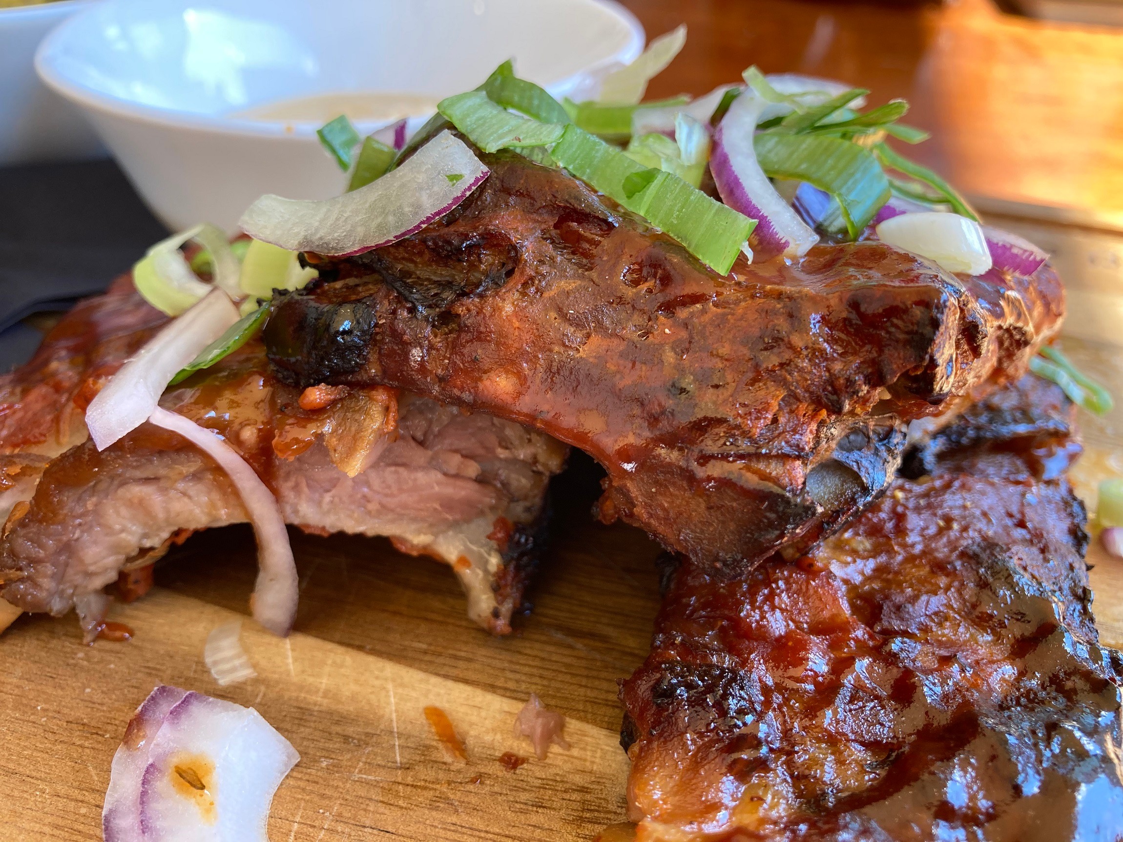 Skúškou trpezlivosti bolo čakanie na druhý chod, jedlo nám priniesli po viac ako polhodine. Je to trochu problém, ak si chcete do reštaurácie len odskočiť na obed, aby ste sa čím skôr vrátili do práce. Grilované rebierka, efektne naservírované aj s prílohami na drevenom podnose, však boli odmenou, ktorá za to stála. Lákavé už na pohľad.