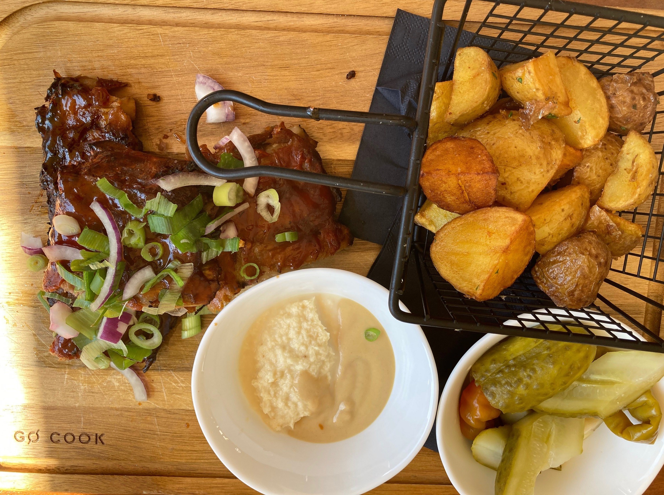 Mäska bolo dosť a bolo skvele ochutené, jemné a šťavnaté. K tomu chrumkavé pečené zemiaky a klasické prílohy - kyslý mix uhoriek, alma paprík a baraních rohov spolu s horčicou a nie príliš ostrým chrenom. Za nás super.