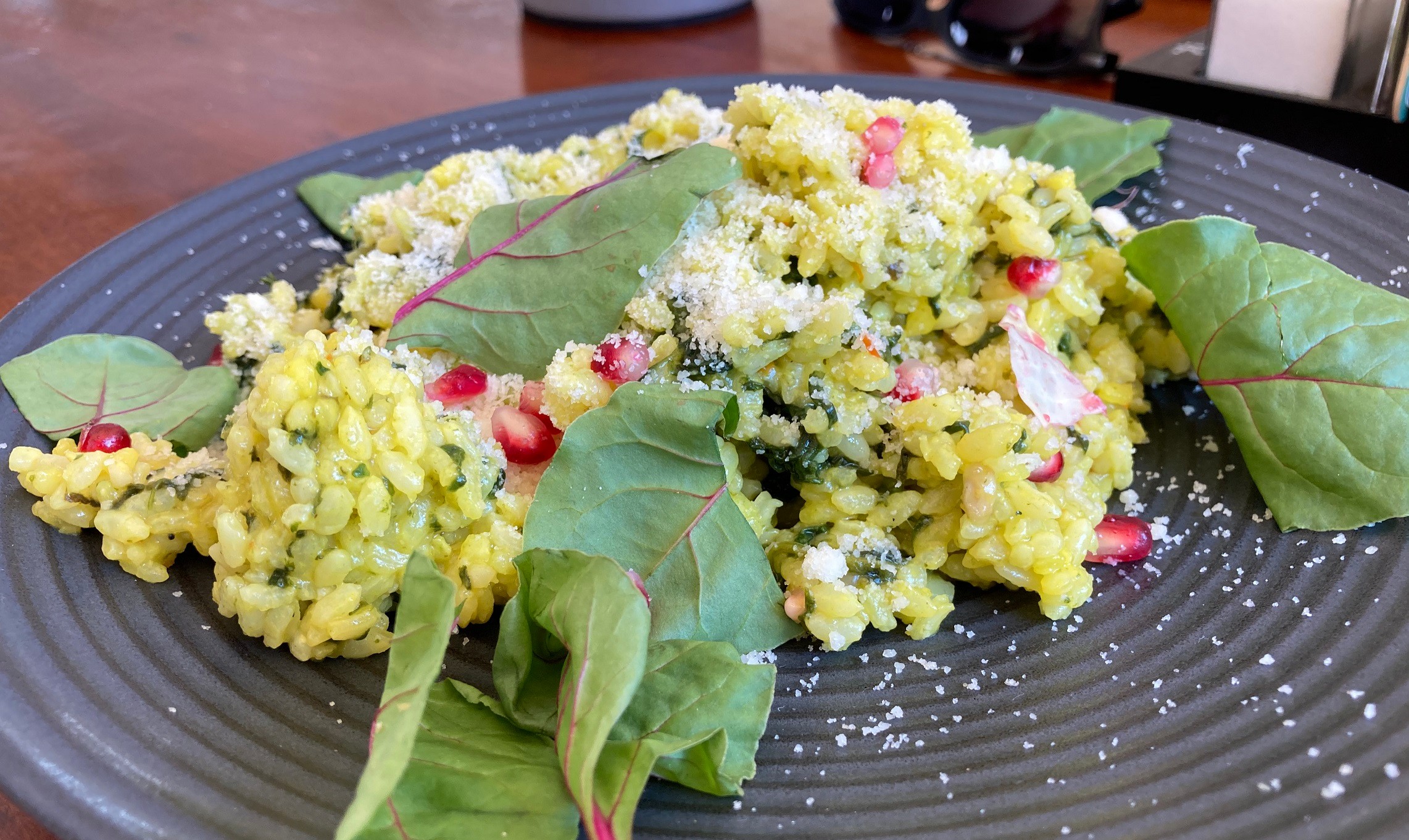Zato šafránovo-špenátové rizoto bolo sklamaním, kým sa totiž dostalo na náš stôl, stihlo úplne vychladnúť. Hoci existujú aj verzie studeného rizota, nešlo o tento prípad. Po upozornení nám čašník, samozrejme, priniesol novú porciu. Na tanieri vyzeralo rizoto efektne, aj konzistencia bola krémová ako má byť, chute však boli vzhľadom na bohatosť ingrediencií chudobnejšie. Kolegyňa neodolala zlozvyku siahnuť po soľničke, ďalší náš degustátor bol však celkom spokojný, len by pridal o čosi viac parmezánu.