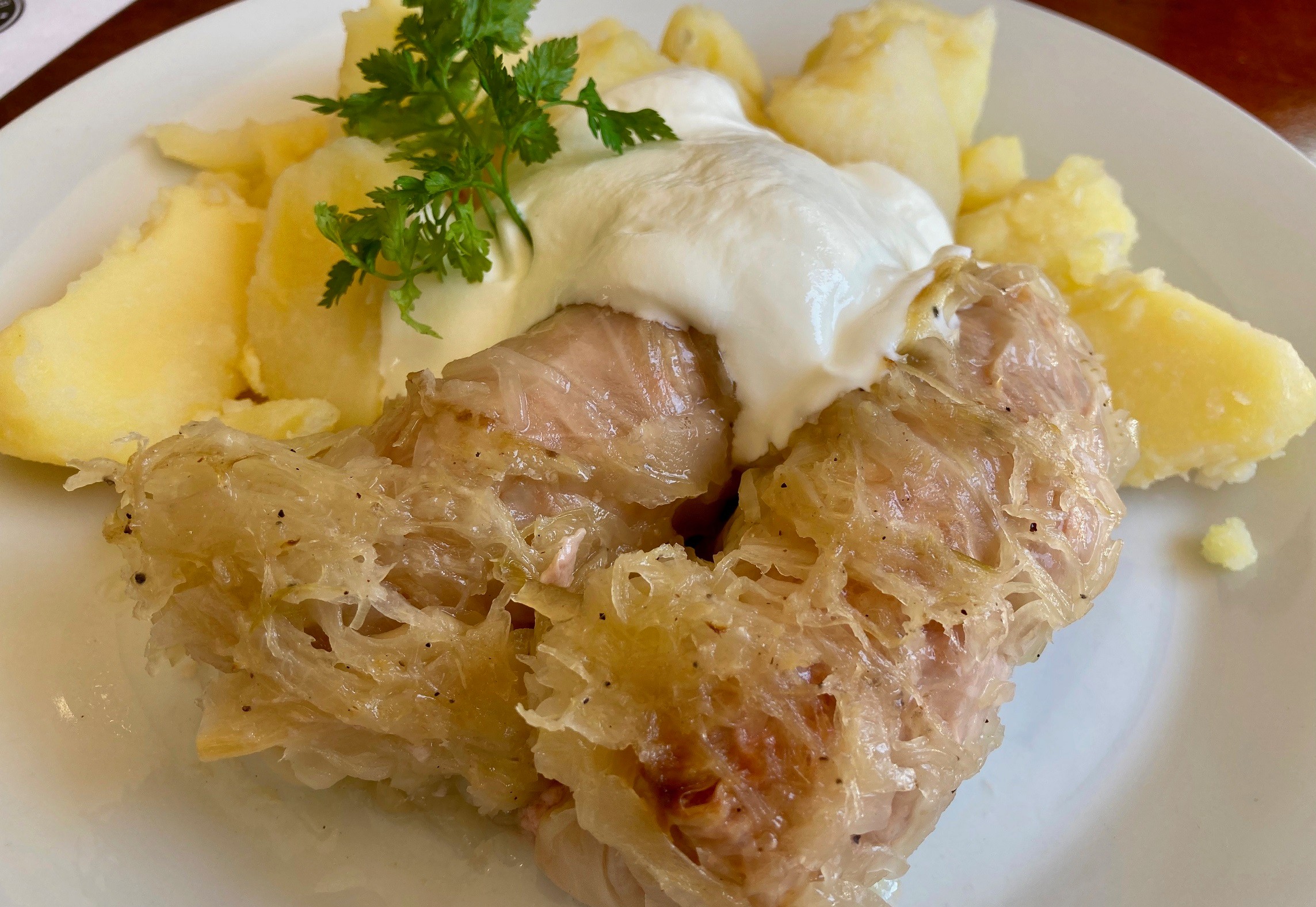 Nesklamala ani druhá voľba, plnený kapustný list, hoci s kapustou sme trochu bojovali, ťažšie sa krájala. Mleté bravčové mäso zabalené v liste nebolo ani pikantné, ani fádne, ochutené tak akurát. Varené zemiaky preliate roztopeným maslom sú síce jednoduchou prílohou, ale tieto sme si vyslovene vychutnali.