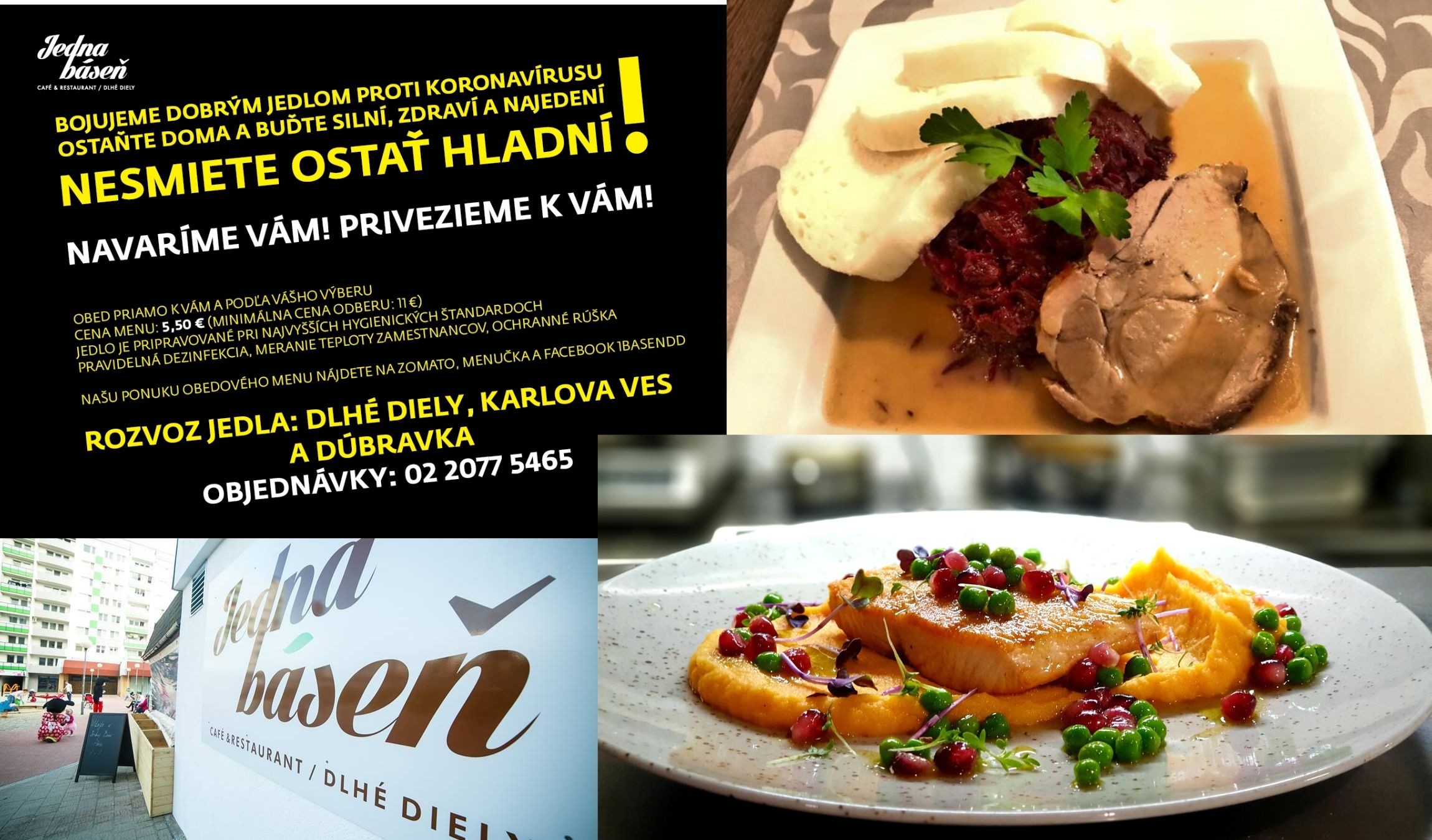Reštaurácia Jedna Báseň na Dlhých Dieloch sa rozhodla bojovať proti koronavírusu dobrým jedlom. Vyzýva ľudí, aby zostali doma a objednali si pochúťku z jej atraktívnej ponuky pred dvere. Jedlá sú pripravované pri dodržaní najvyšších hygienických štandardov. Samozrejmosťou je pravidelná dezinfekcia, ochranné rúška a meranie teploty zamestnancov. Reštaurácia ponúka 4 druhy obedového menu denne od 11.00 do 15.00 hod. a výber z 18 druhov pizze. Večerné menu je od 17.00 do 21.00, pričom taktiež sú v ponuke 4 druhy. Pri osobnom odbere je zvýhodnená cena obedového menu 4,99 € (vrátane polievky) a večerného menu 6,50 € (vrátane polievky). Rozvoz je zabezpečený v mestských častiach Karlova Ves, Dlhé Diely a Dúbravka. Pri objednávke nad 11 € je donáška zdarma. Od 17.00 hod. je v ponuke výber z klasických domácich hotových jedál aj minútiek.