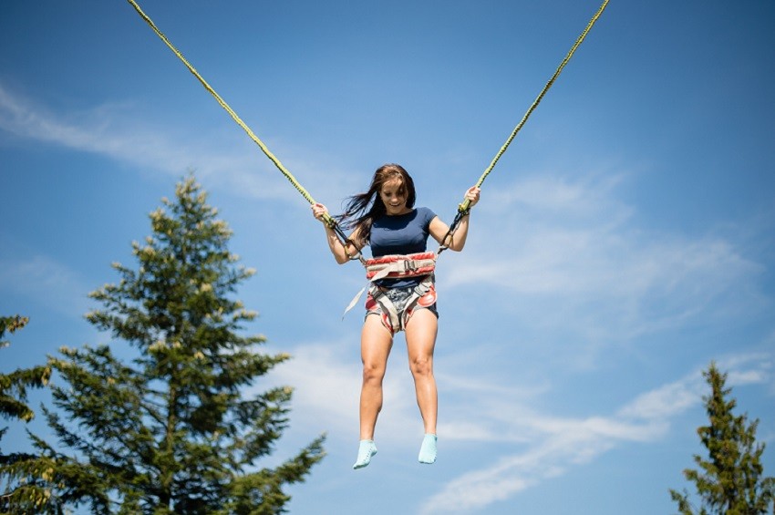 X-jump trampolíny - saltá, dvojité či trojité skoky do výšky až 7 metrov nie sú na X-jump trampolíne žiaden problém. Sedák do ktorého vás pripútajú je upevnený na niekoľkých lanách spojených konštrukciou X-jump. To vám umožní skákať ako sa vám páči.