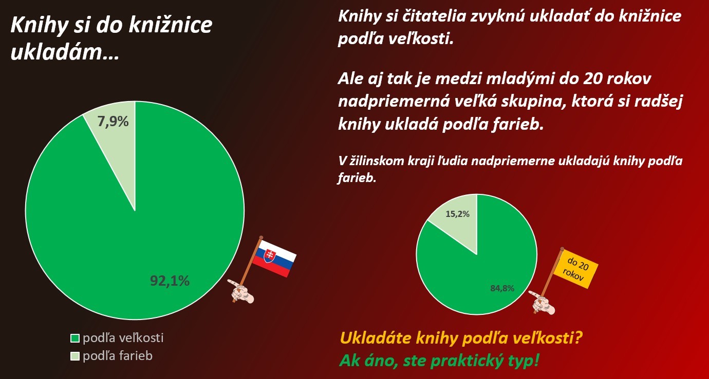 Ako vyzerá tá vaša domáca knižnica? Máte ju podľa niečoho usporiadanú? Podľa autorov, noviniek, farby, názvov, sérií? Alebo máte naukladané knihy len tak hala-bala? Knihy si slovenskí čitatelia zvyknú ukladať do knižnice podľa veľkosti. Ale aj tak je medzi mladými do 20 rokov nadpriemerná veľká skupina, ktorá si radšej knihy ukladá podľa farieb (napríklad v žilinskom kraji ľudia nadpriemerne ukladajú knihy podľa farieb).
