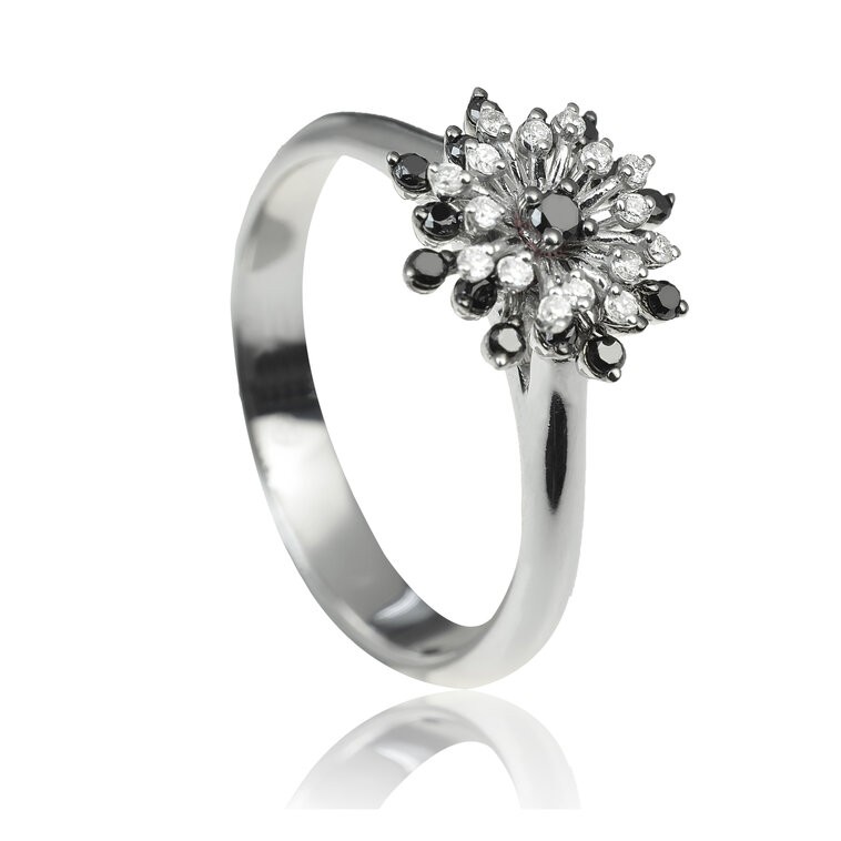 Jeden centrálny kameň okolo ktorého sú usporiadané ostatné do tvaru kvetinky. Obľúbený model klenotníčok z Goldie klenoty je vyskladaný z bielych a čiernych diamantov.