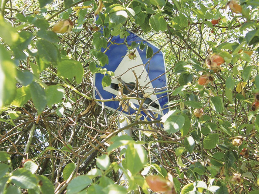 Ukážkovo zarastená dopravná značka je na Royovej ulici v Novom Meste, kde sa v šípovom poraste skrýva informatívna značka Spomaľovací prah. Koho informuje, možno budú vedieť na miestnom úrade...