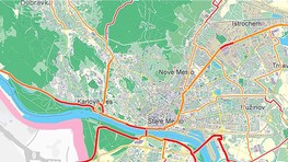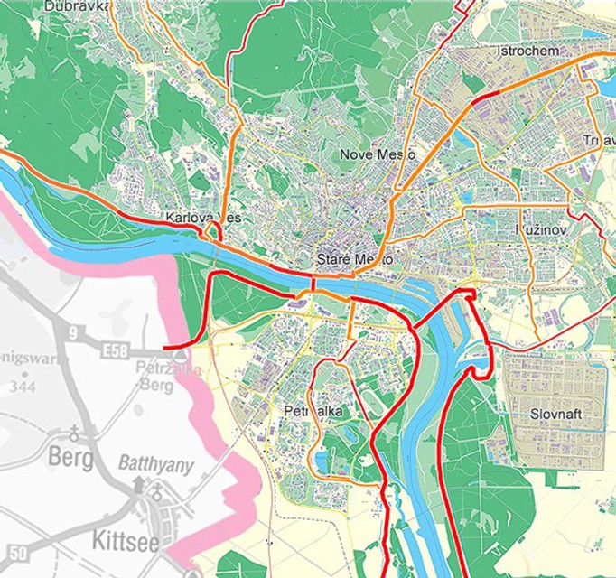 Na mape sú červenou farbou znázornené existujúce cyklistické trasy, oranžovou navrhované trasy.
