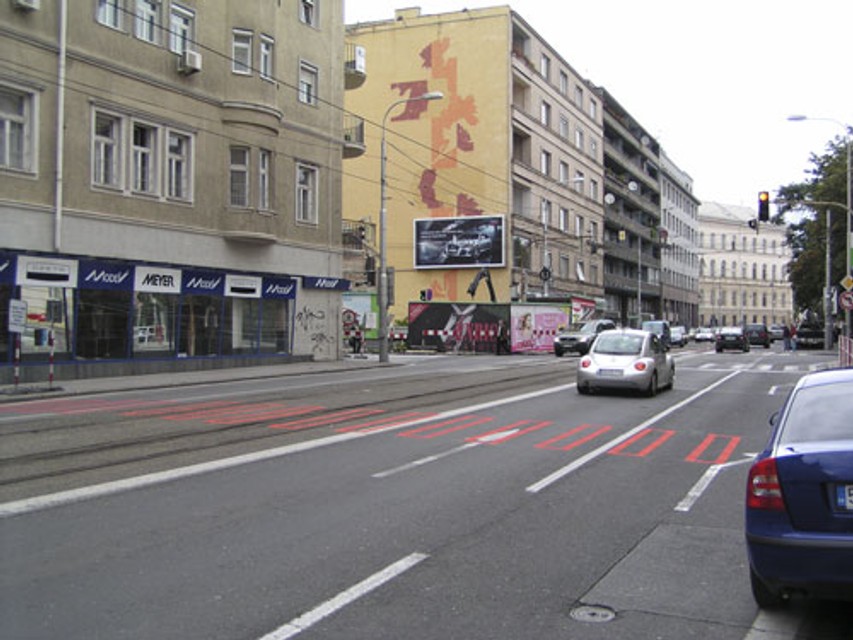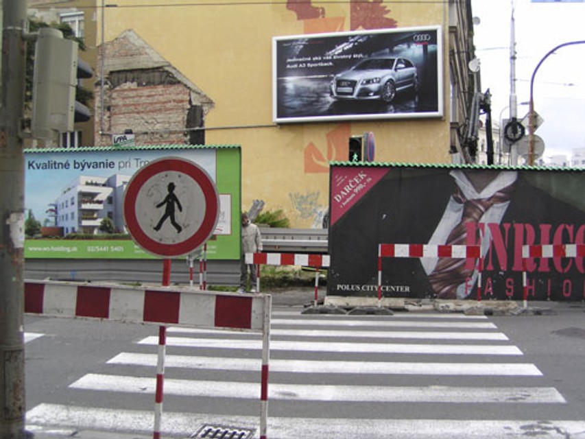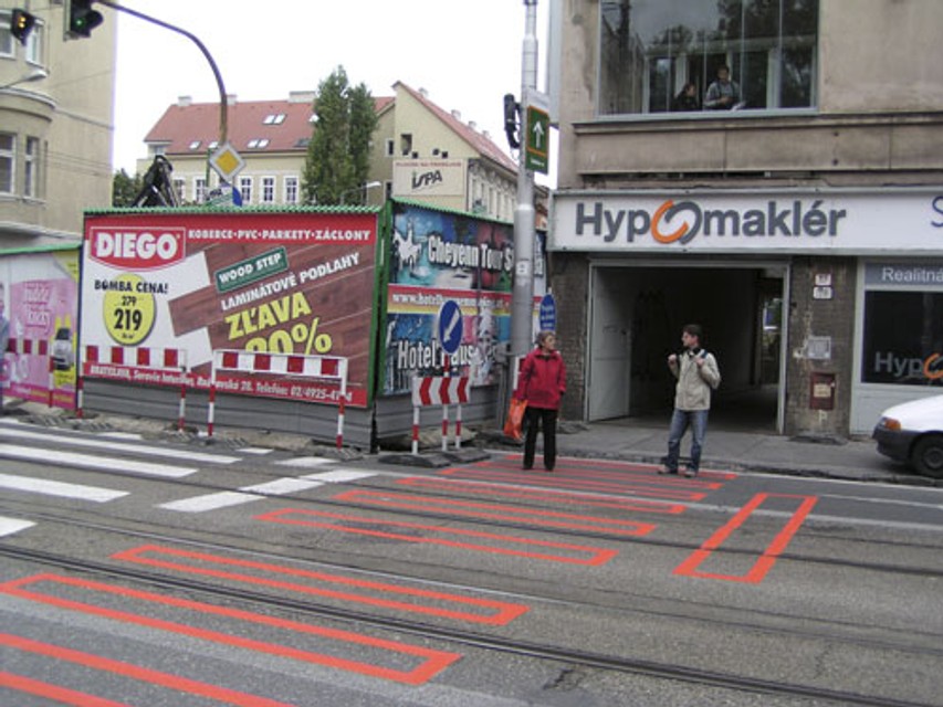 Prečo to správca komunikácie a polícia povolili, je záhadou. Stačilo osadenie stĺpikov, pomedzi ktoré sa chodec pohodlne dostane. Namiesto toho vznikol asi o 25 metrov ďalej, smerom k Dvom levom dočasný oranžový priechod pre chodcov. Samozrejme, už bez svetelnej signalizácie, teda bez ochrany.
