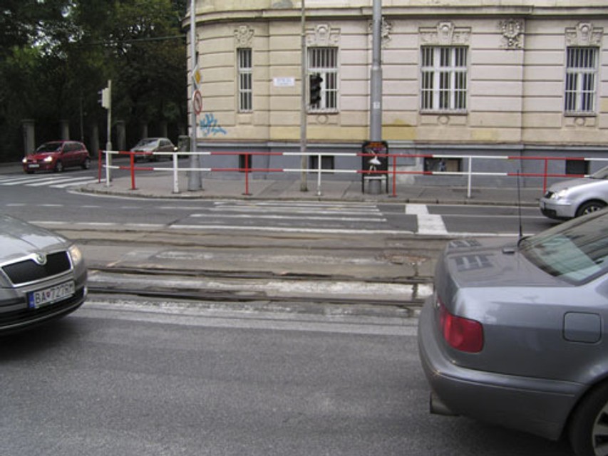 Navyše prechod cez svetelne riadený priechod pre chodcov je znemožnený kvôli osadenému zábradliu. Nezmyselne položené zábradlie síce znemožňuje parkovanie áut na chodníku pred budovou vojenskej správy, no fakticky znefunkčnilo križovatku a bezpečné prechádzanie cez ňu.