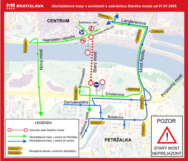 Starý most v Bratislave bude od 31. 12. 2008 od 19.00 h uzavretý pre individuálnu dopravu z dôvodu jeho zhoršujúceho sa stavebno-technického stavu a na základe výsledkov posúdenia statickej a dynamickej únosnosti mostnej konštrukcie.