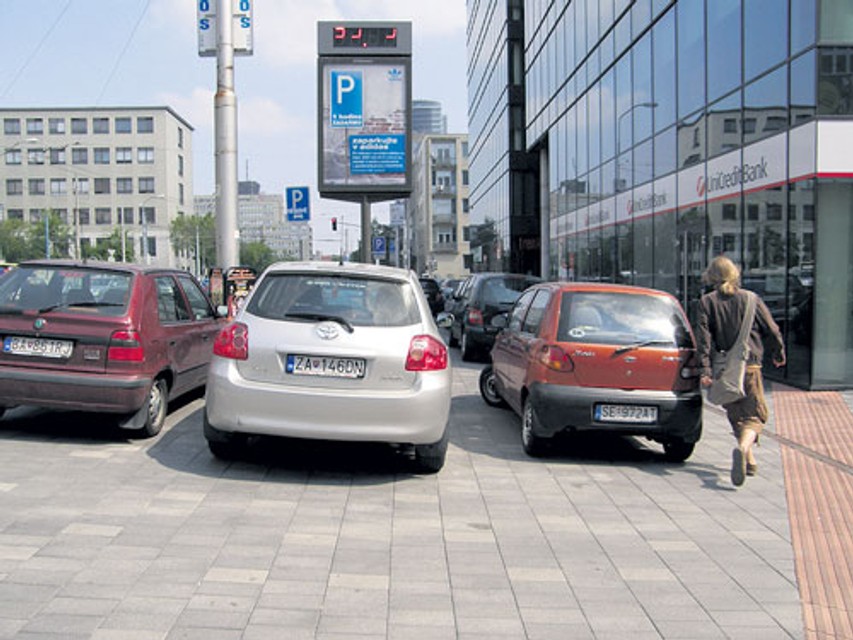Na chodníku v okolí budovy Park One, ktorý je rovnako vo vlastníctve mesta (parcela č. 21724/7), takmer celodenne parkujú autá. Najvyšší čas, aby tu samospráva mesta urobila poriadok. Autá parkujúce v troch radoch totiž nenechávajú chodcom často ani poldruhametrový priechod od fasády, ako stanovuje nový cestný zákon.