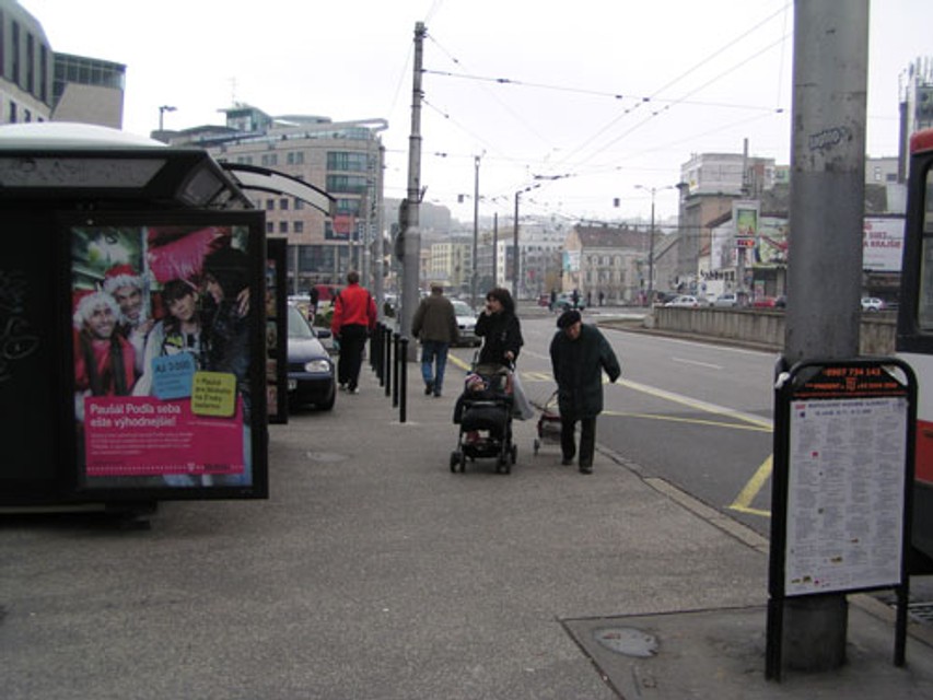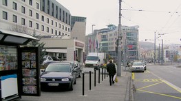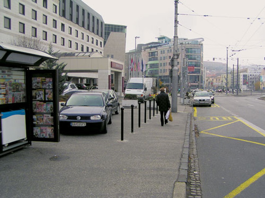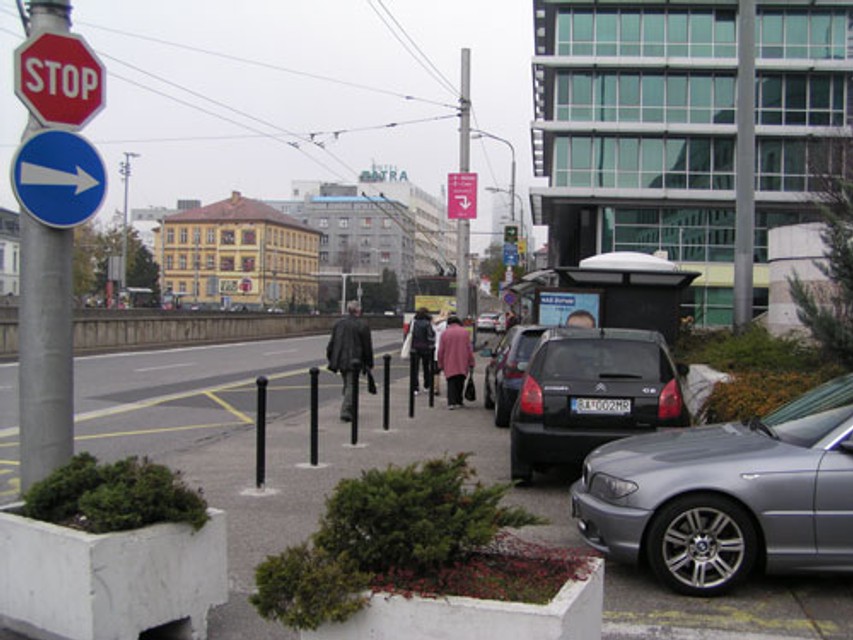 Na státie áut priamo na zastávke MHD na Hodžovom námestí, pri hoteli Crown Plaza sme nedávno upozornili aj v Bratislavských novinách (BN 29/2009). Vodiči tam parkovali bez akýchkoľvek zábran a cestujúci museli niekedy vystupovať priamo do áut.